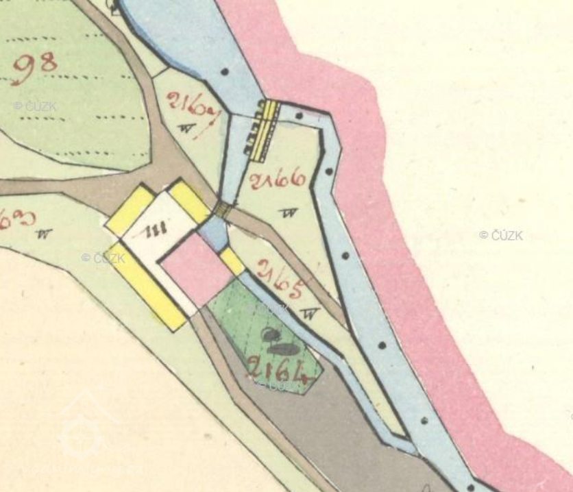 Náhon dnes zasypán, zachovány nepatrné zbytky na jižní straně.