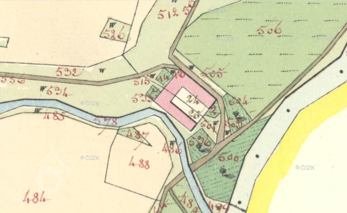 Mlýn pravděpodobně stával na místě dolní části nynější hájenky (č. 15). Byl asi dřevěný o jednom sloţení a vodním kole, poháněn vodou z potoka Mařek, který pramení u obce Hodov. Hájenka stojí těsně na samém břehu potoka a na jeho korytě je dosud patrné roubení (opěrná zeď) v délce 20 metrů. V těchto místech je koryto hluboké 2 metry. Na horní části hájenky (č. 16) Osové býval jiţ zmiňovaný dvůr. Číslo 15 je dnes obydleno rodinou Práškovou a číslo 16 rodinou Smejkalovou.