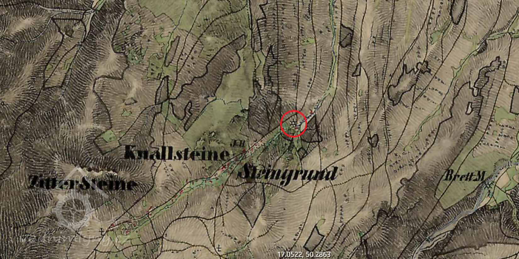 Zaniklý malý vysoko položený mlýn na soutoku dvou bezejmenných potoků.