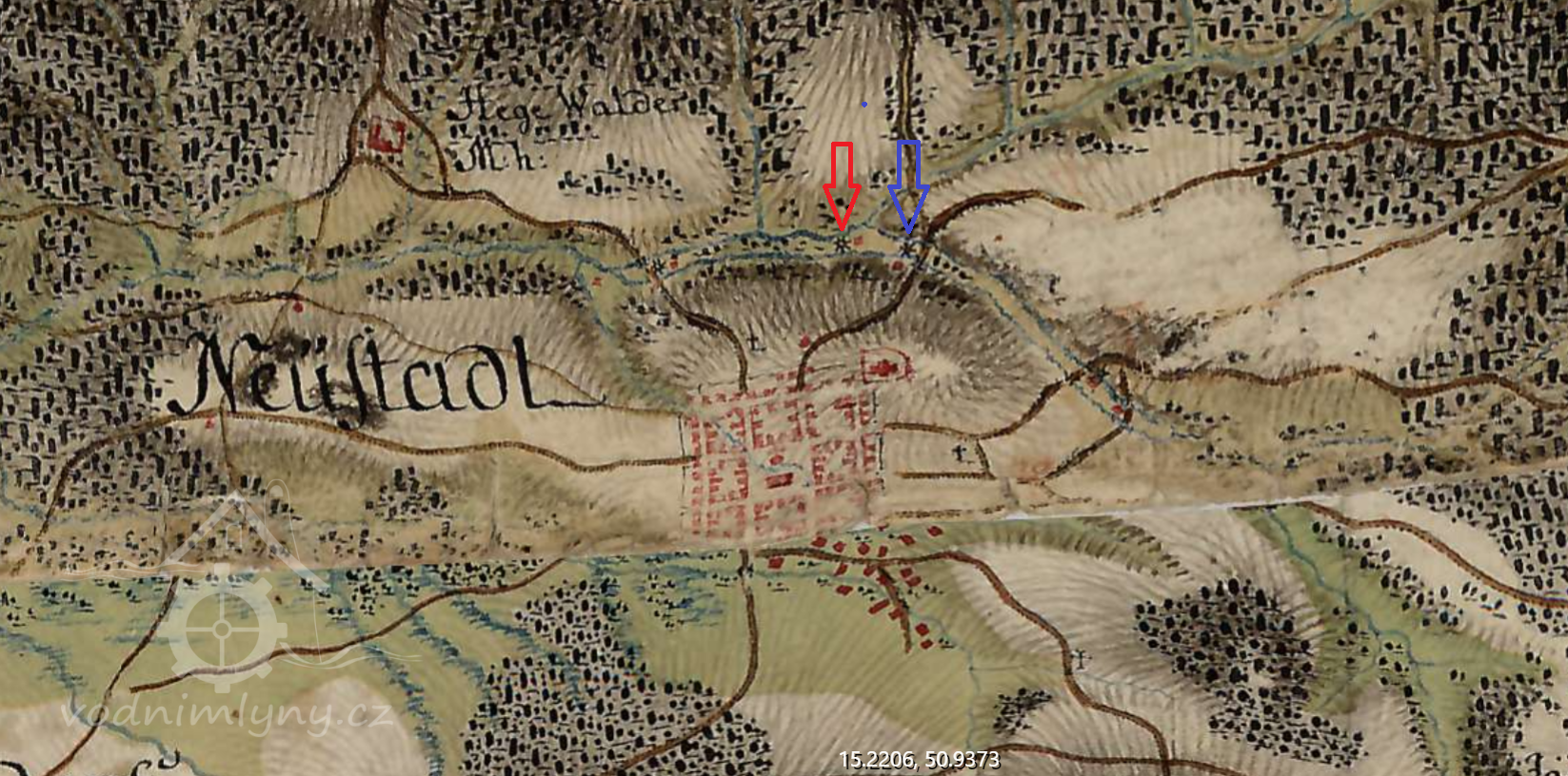 1757 Tereziánský katastr dominikál: 2 mlýny po 1 kole na nestálé vodě