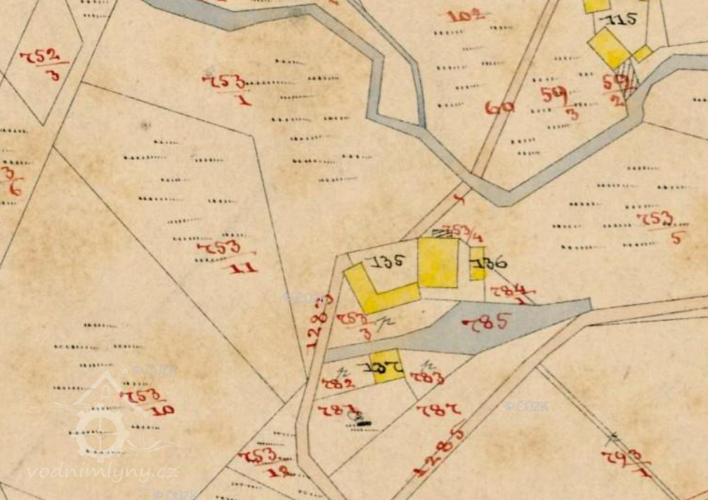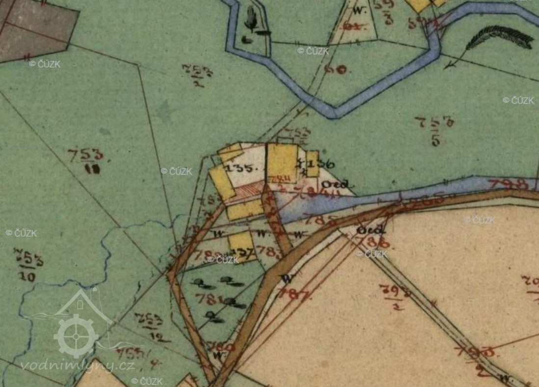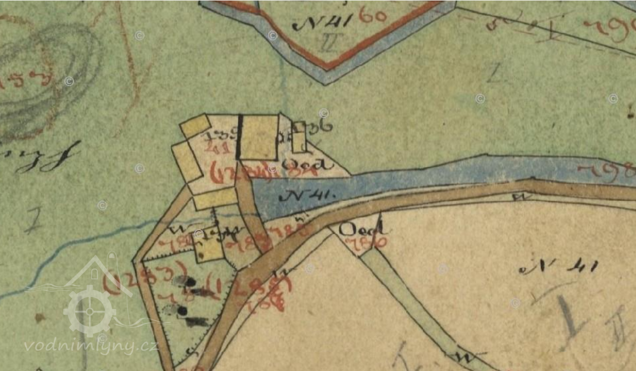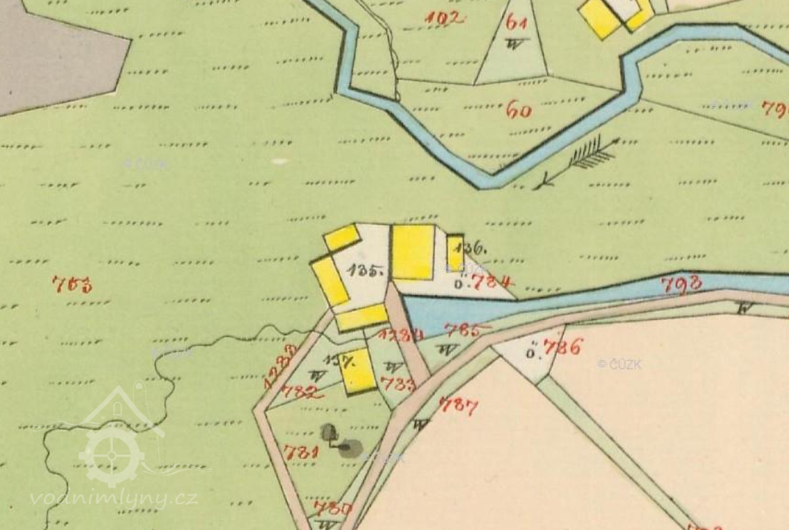 1930: 2 kola na svrchní vodu (jedno pro pilu), hltnost 2 x 0,21 m3/s, spád 3,9 a 4 m, výkon 2 x 5,2 HP, prům. 480 cm