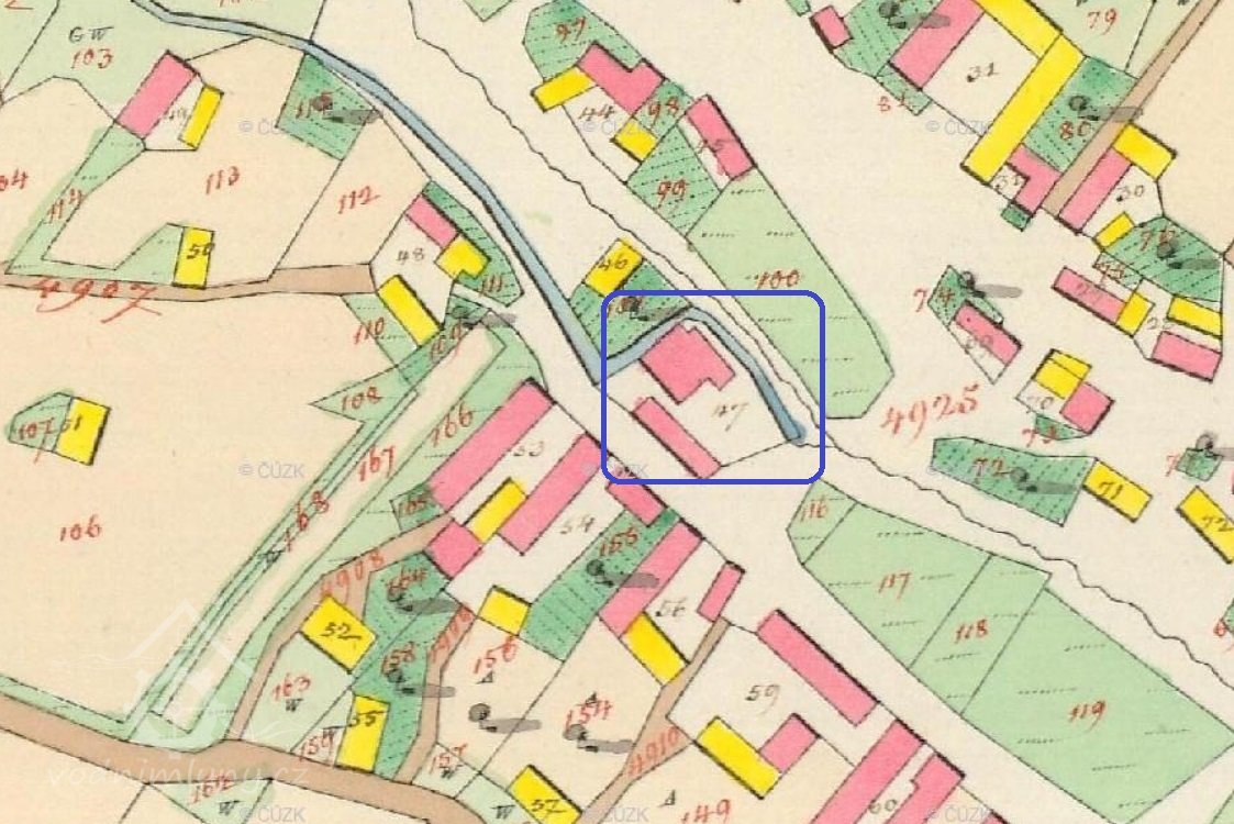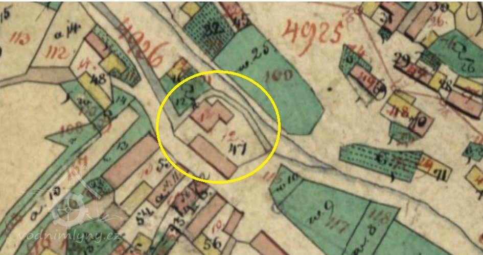 Malý mlýn uprostřed obce, tvořený poněkud bizarním shlukem stavení.