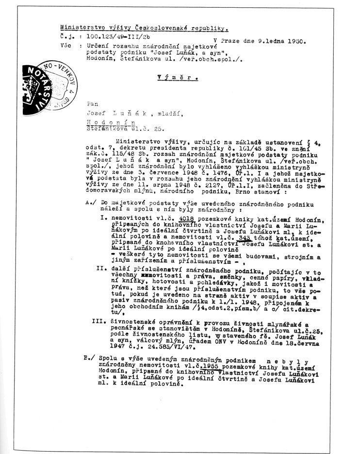 od 1935 na mlýně pracuje i syn Josef Luňák ml. (*12.1.1919), vyučený mlynář a absolvent jednoročního mlynářského kursu na Státní mlynářské a pekařské škole v Břeclavi
