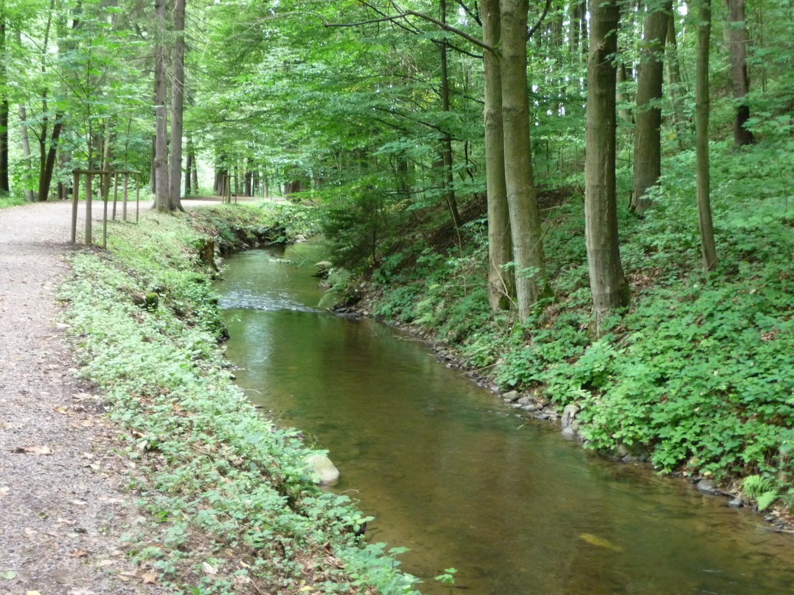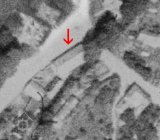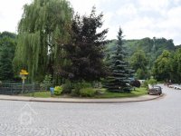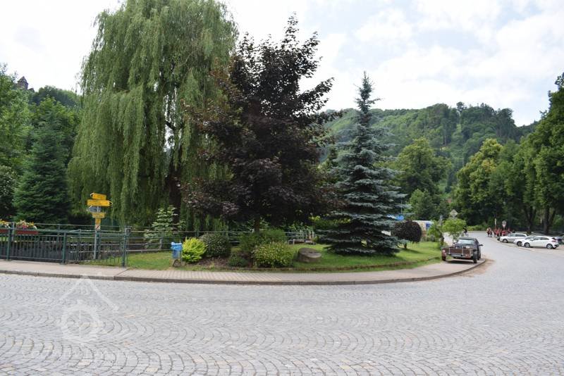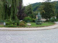 Uprostřed obce na křižovatce hlavních ulic u mostu přes náhon