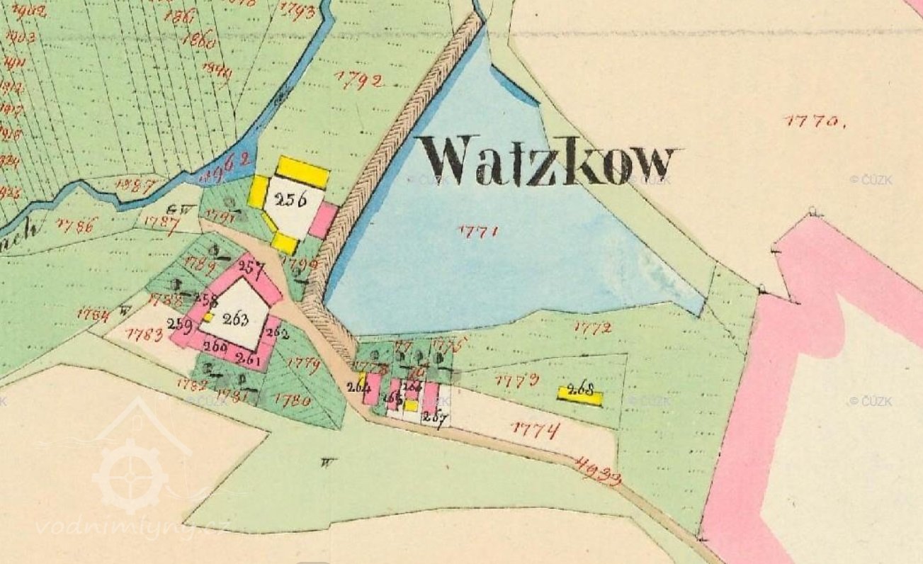...Melivo vozí se do šesti mlýnů ležících na dvou potocích. Z těch větší přitéká ode Lhotky a naplňuje nejprve rybník u mlýna na Vackově. Vackov je skupení jedenácti chalup kolem mlýna čtvrt hodiny cesty k východu od Černovic. Mlýn ten patříval před časy k Svatavě, ale r. 1596 k žádosti mlynáře Václava připojen jest od Petra Voka z Rozemberka k Černovicům. Blíže městu pod Vackovem protéká potok rybník u mlýna „Ťápalova“, kdež i pila se nalézá. Na SV. pod Moudrovem vzniká potok druhý, naplňuje rybníky „Hořejší“ a „Dolejší“ při mlýnech týchž jmen, ležících u samého městečka, odtud teče Předměstím a Pršínem, kdež je most kamenný se sochami sv. Jana Nepomuckého a sv. V8clava a při západní straně města běží do obory, kdež se spojuje s potokem prve dotčeným. Část vody shražená žene pod oborou mlýn „Šelichův“ a ještě dpleji naplňuje rybník hluboký s koupadlem u mlýna Louckých. V létech suchých potoky tak málo vody rybníkům dodávají, že jen po přestávkách, vždy až se rybník naplní, mlýti se může... (pep)
