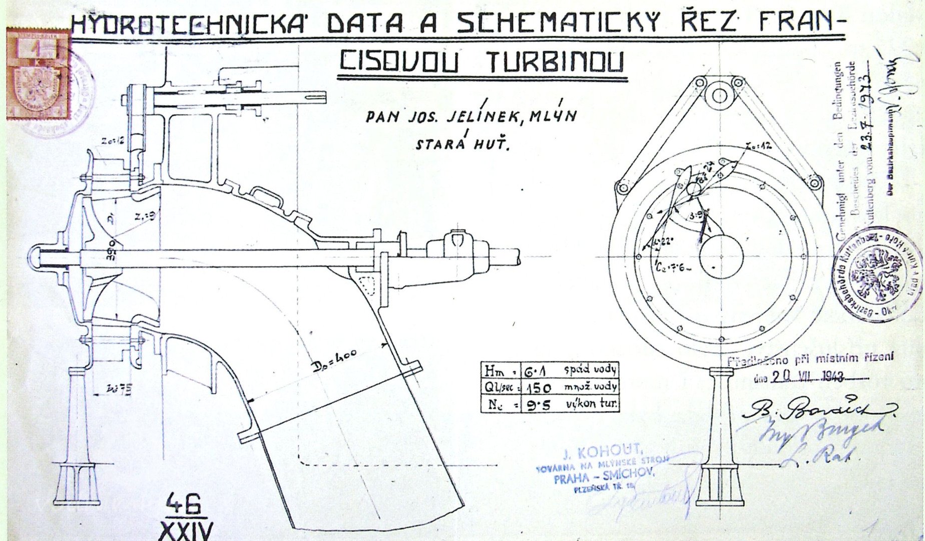 1. 7. 1943 Josef Jelínek žádá o povolení instalovat Francisovu turbínu