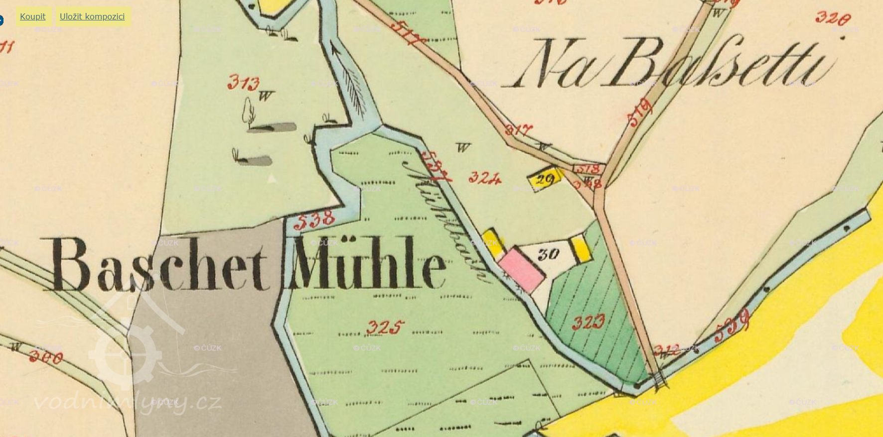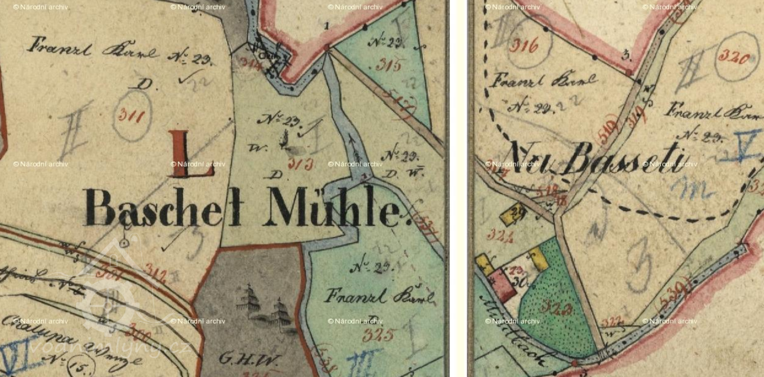 Mlýn č. p. 22 v Bašeti leží na potoku Zbraslavském a voda zdýmá se nade mlýnem jezem ze dřeva zhotoveného a vede se náhonem ku mlýnu a pile.