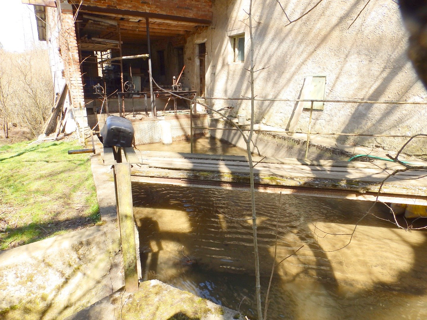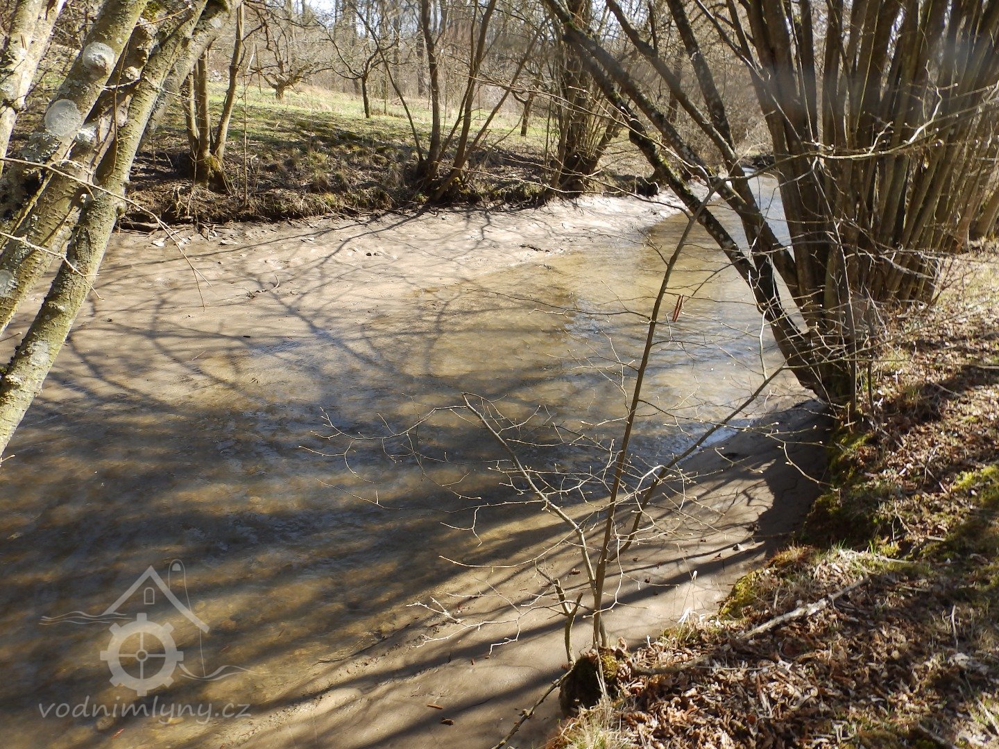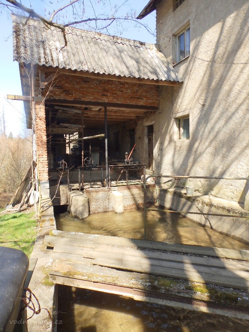 Voda je vedena náhonem ku mlýnu. U mlýna jsou betonová vantroka 1,90 m široká, 0,63 m hluboká, v nich nadržována jest voda do výše 0,50 m. Žlab ukončen jest dvěma stavidly, z nichž levé má šířku 52 cm a slouží k vypouštění vody na jalovo, pravým otvorem 0,80 m širokým pouští se voda do žlabu na vodní kolo. Tento jest 6 m dlouhý, 82 cm široký a 23 cm hluboký.
