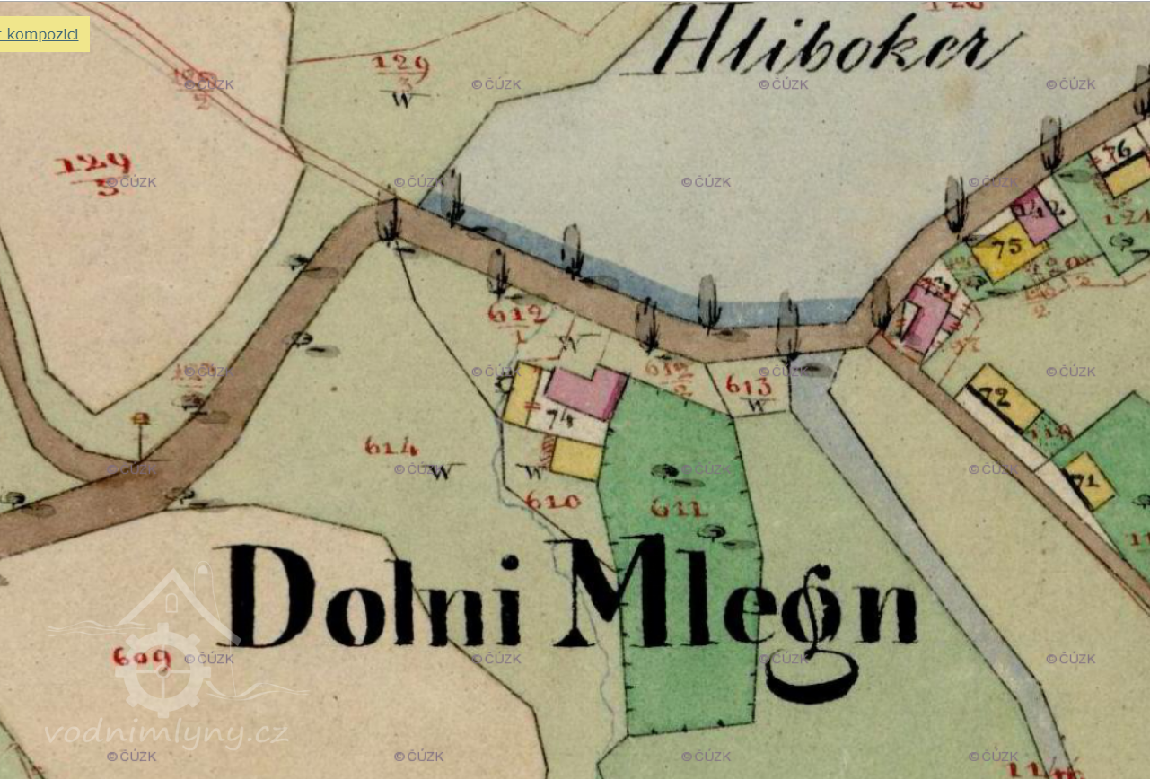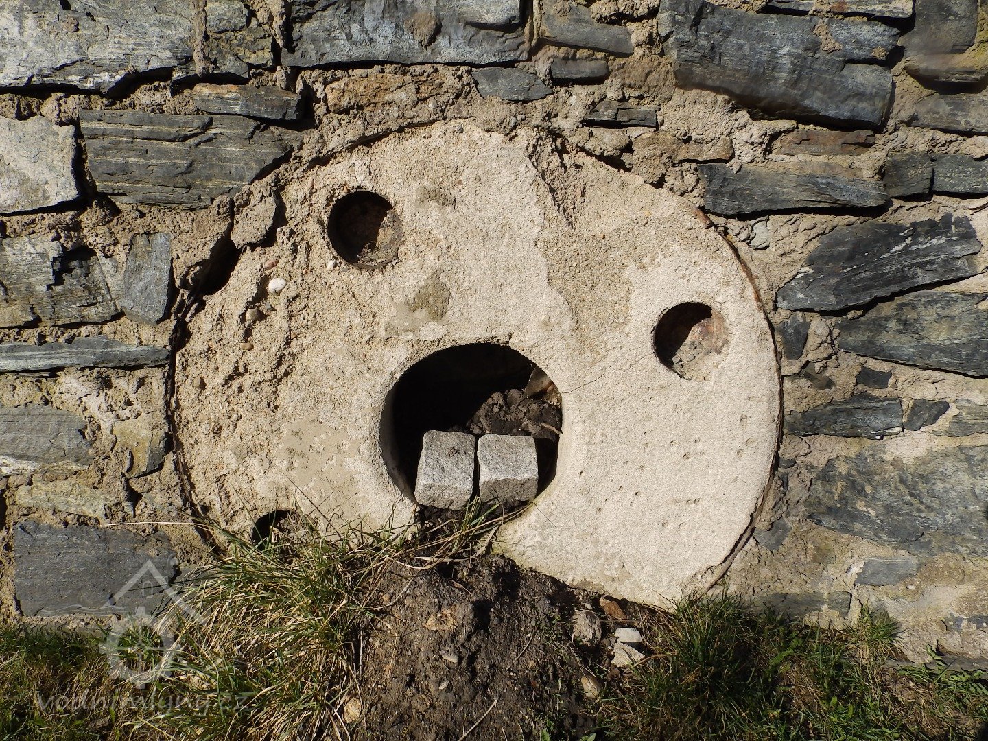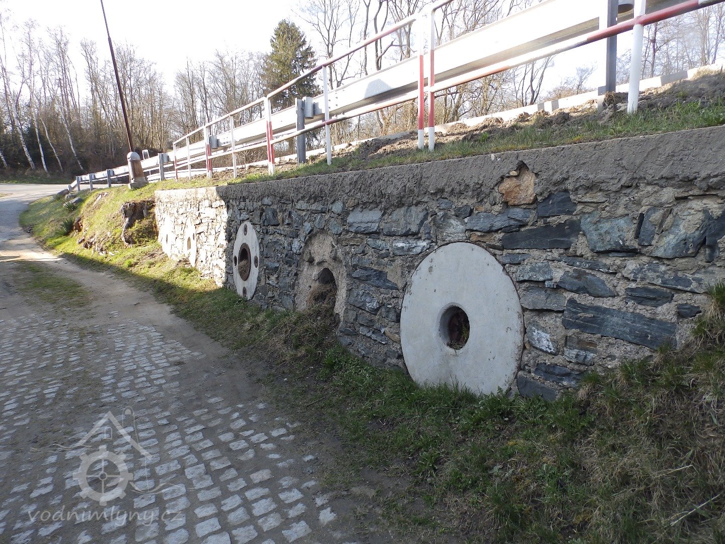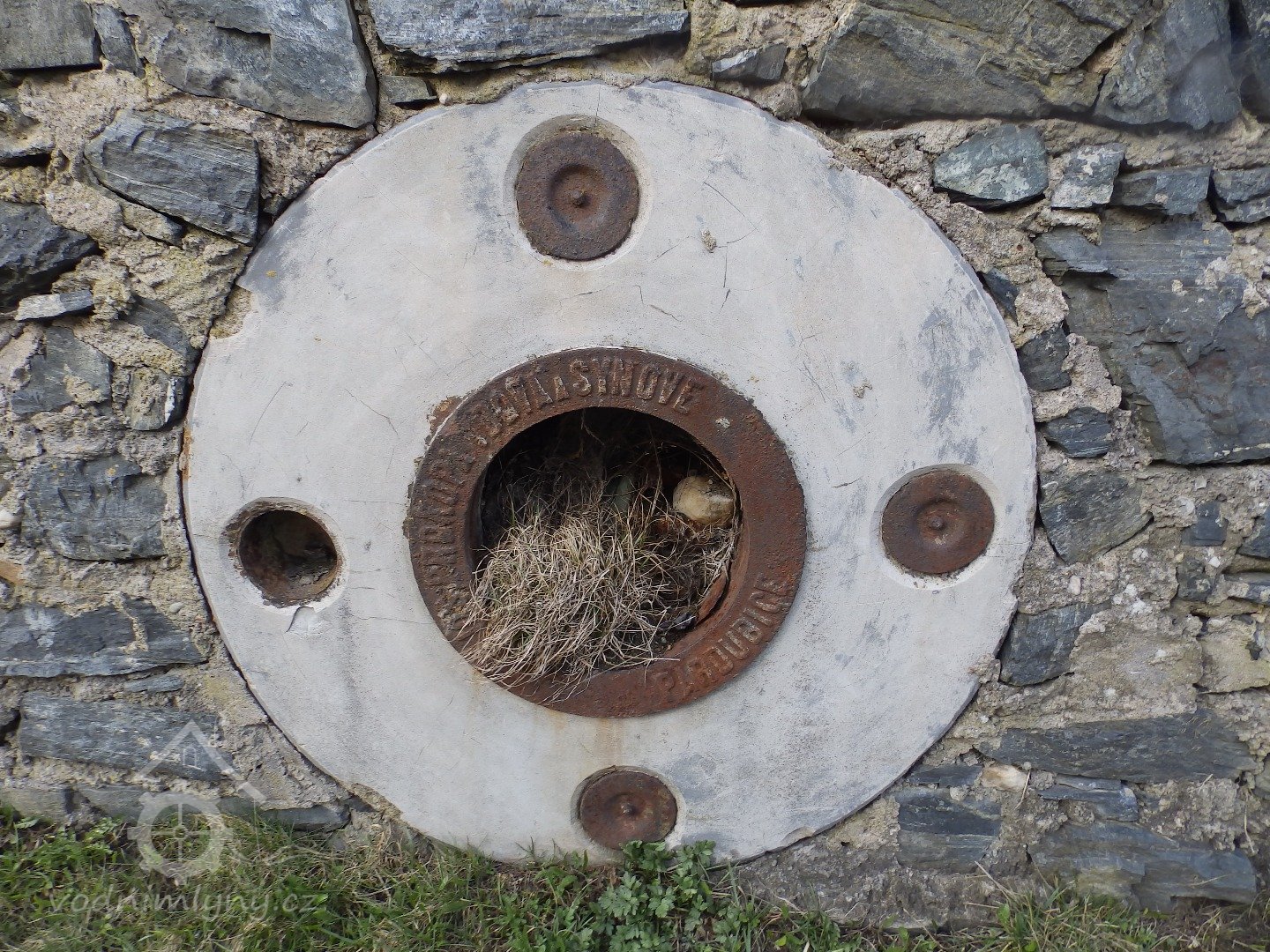 Popis1890: 1 kolo na svrchní vodu, prům. cca 5 m, šířka mezi věnci 38 cm, hloubka korečku 21 cm, obvodová rychlost 1,83 m/s, spotřeba vody 65 - 70 l/s.