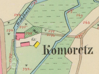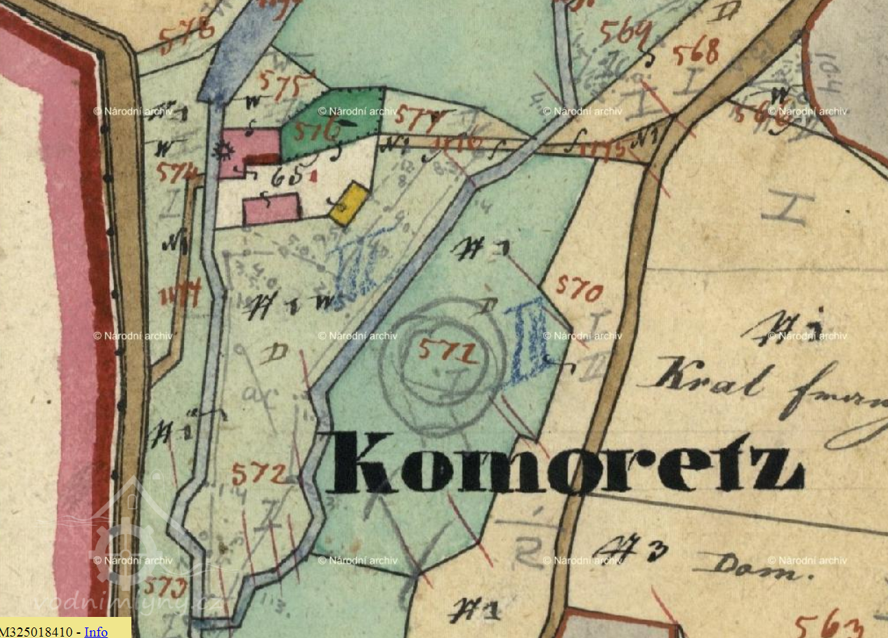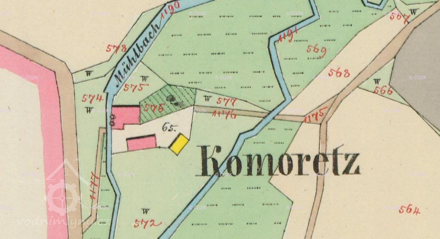 1586 - Mlejn korečný na 2 kola dobře vystavěný, z něhož měřičného obilí do roku vychází do 60 strychů víc i míň, též i prachu, jímž do roku vykrmiti může při nejmenším 8 vepřů (SOA Třeboň, Cizí statky Třeboň – registratura, sign. II 130 A–1. Mladší odhad statku Komorce z roku 1586).