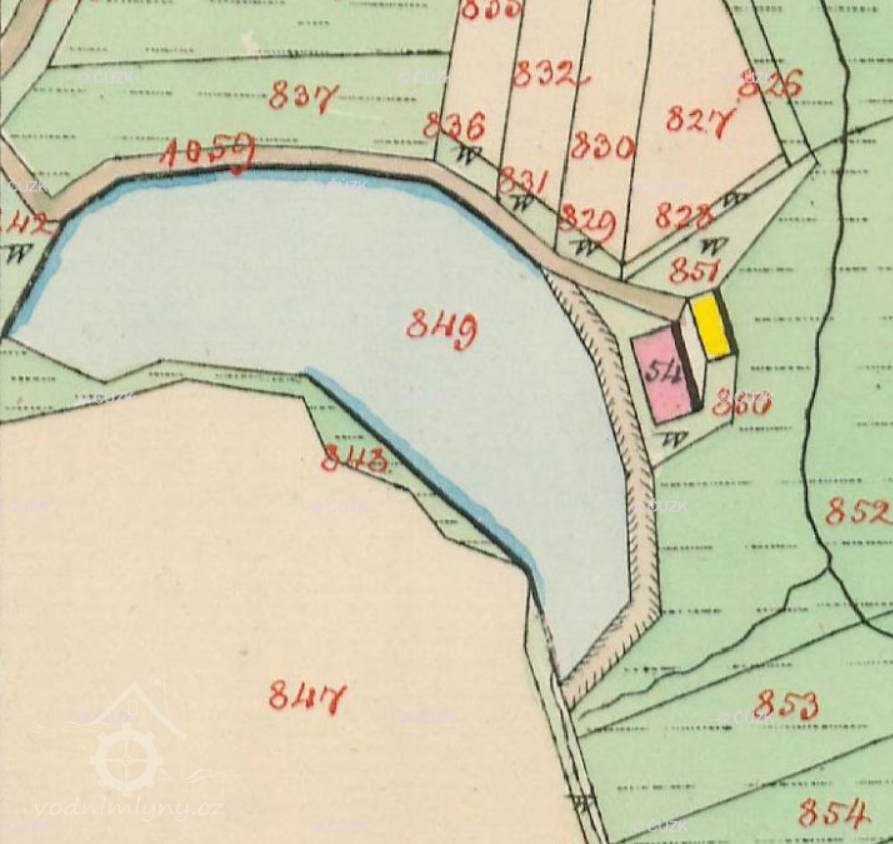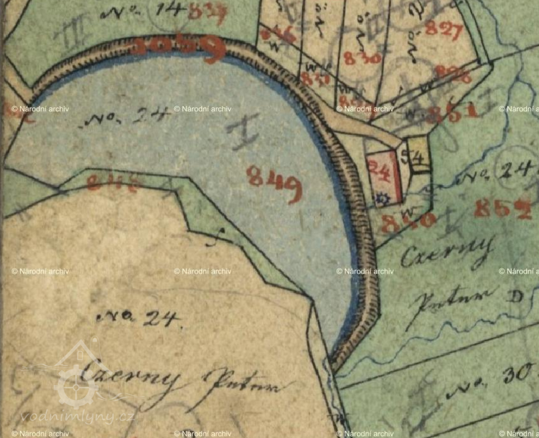 Rybník ledvinovitého tvaru nad mlýnem dnes vypuštěn a zrušen
