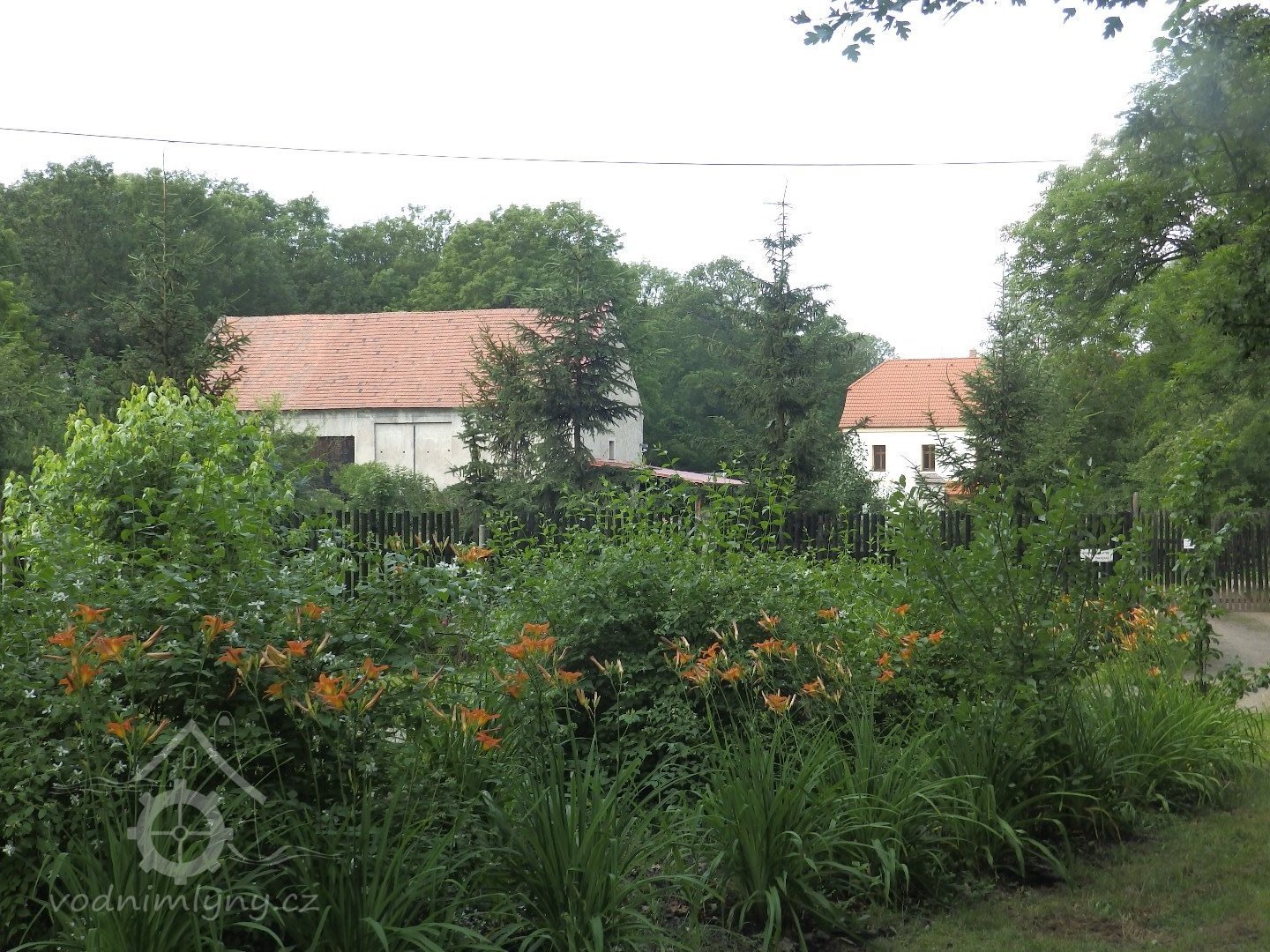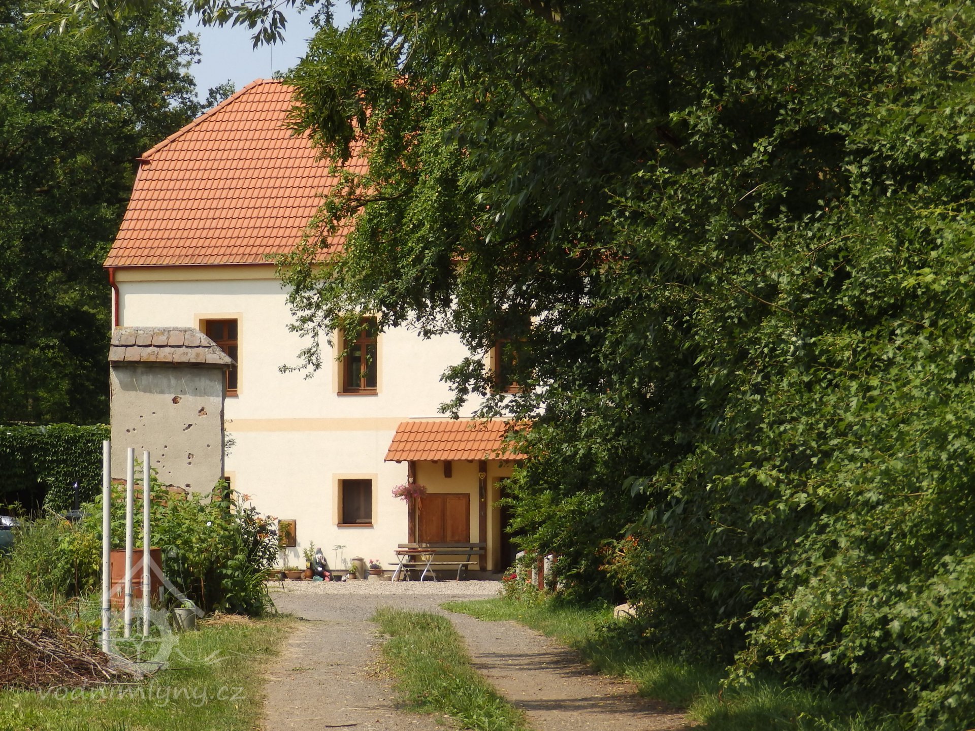 Mlýnice a stodola rovnoběžně, o jednu délku navzájem posunuty.