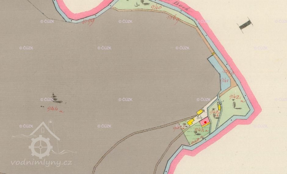 Popis1930: 1 kolo na svrchní vodu, hltnost 0,115 m3/s, spád 4,25 m, výkon 4,8 HP