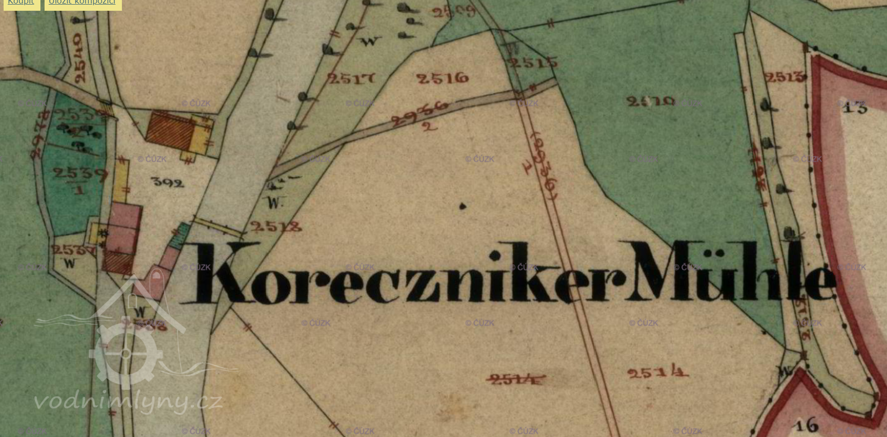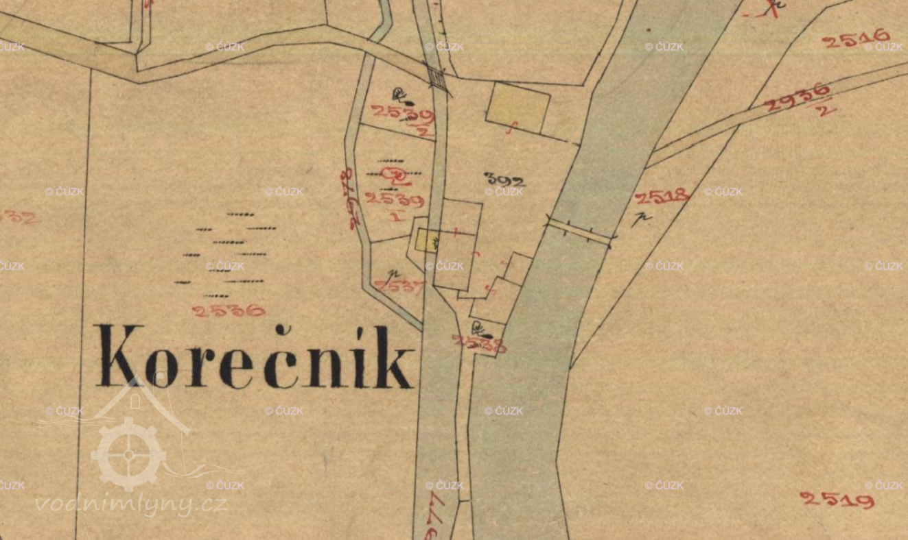 Soustavu původních mlýnů a hutí v údolí Padrťského potoka doplňoval o něco proti proudu mlýn Korečník čp.104/II. Jméno „Korečník“ se připomíná už v 16.století. Podle majitelů ve 20.století nazýván i „Pražákův mlýn“.