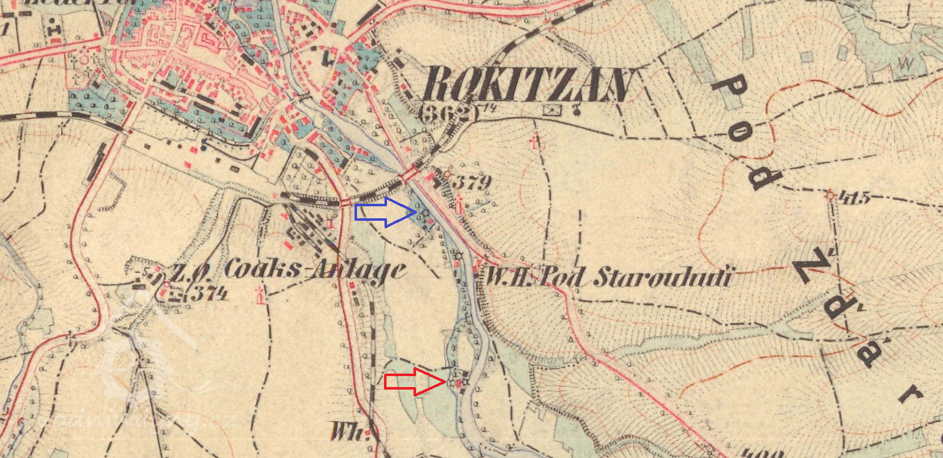 Velký mlýn, první na rokycanském katastru, zbořený po roce 1962, na jeho místě dnes stojí lisovna plastů firmy Inkos Rokycany s.r.o.