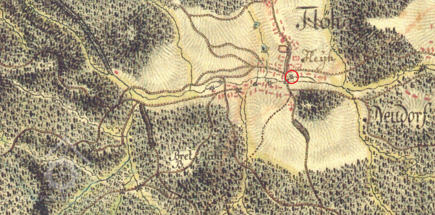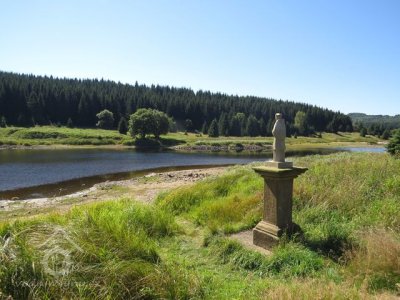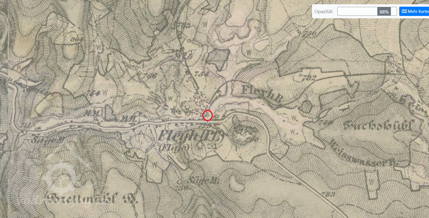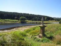 1963 zatopen přehradní nádrží Fláje, předtím zbořen