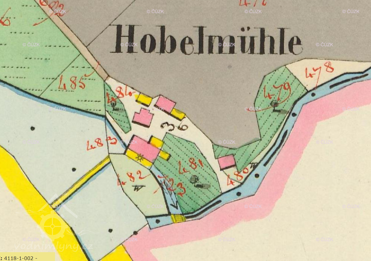 Popis1930: 1 kolo na spodní vodu, hltnost 1,655 m3/s, spád 1,3 m, výkon 8,6 HP