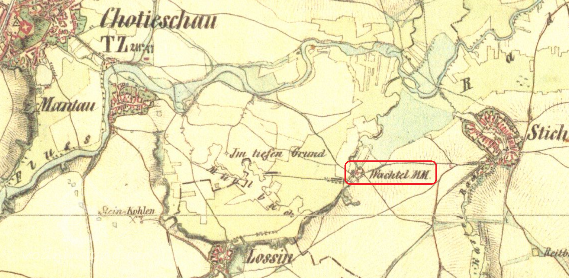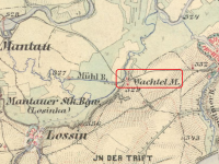 Velký mlýn uzavřené dispozice na samotě mezi Mantovem a Vstišem. 1930 již nebyl v provozu, v současné době neobývaný.