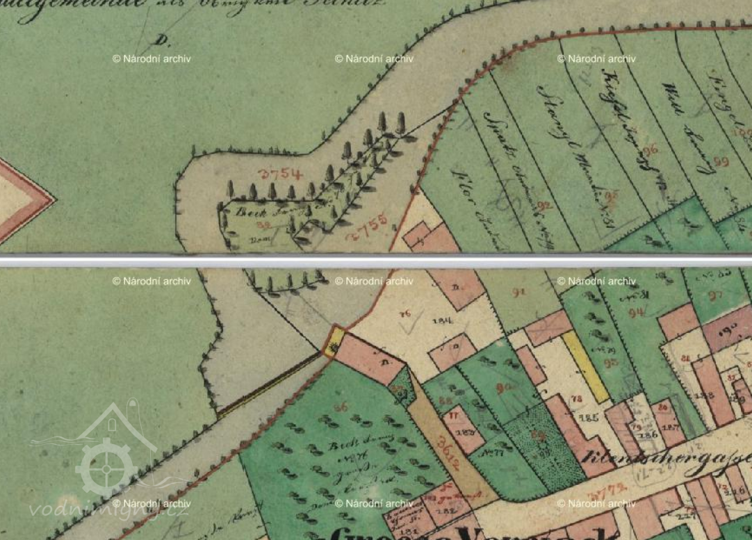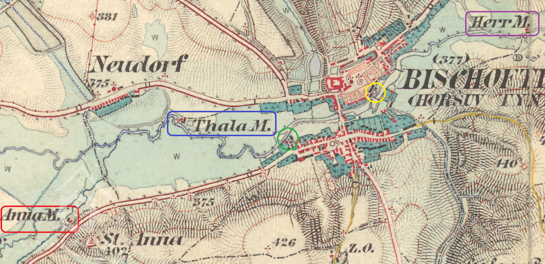 Popis1930: 2 kola na spodní vodu, hltnost 1,542 m3/s, spád 1 m, výkon 7,2 HP