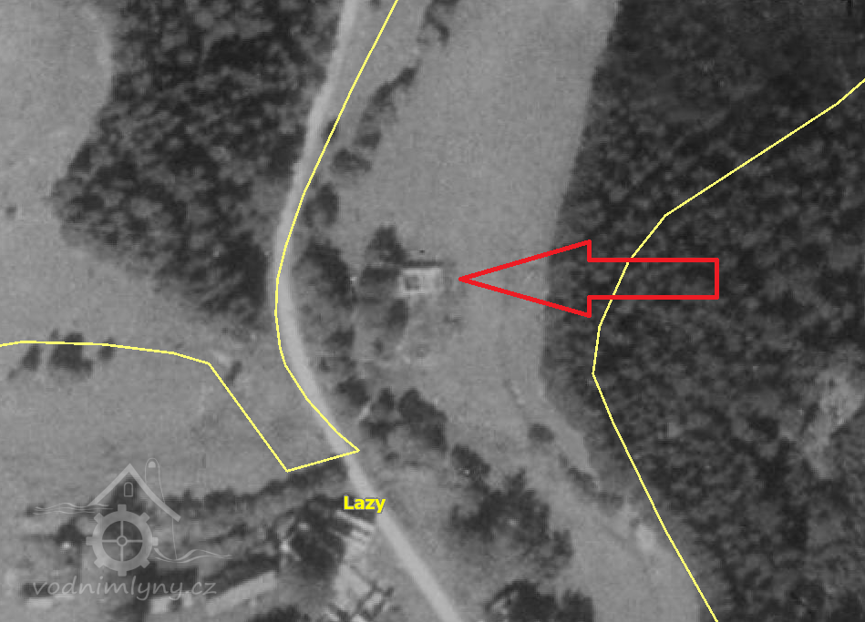 Mlýn založený patrně na počátku 19. stol. zpočátku na samotě, postupně kolem něho vyrostla osada Dolní Lazy. Původní obilní mlýn sloužil po I. světové válce jako pila. Zanikl po II. světové válce v souvislosti se zřízením VVT Prameny.