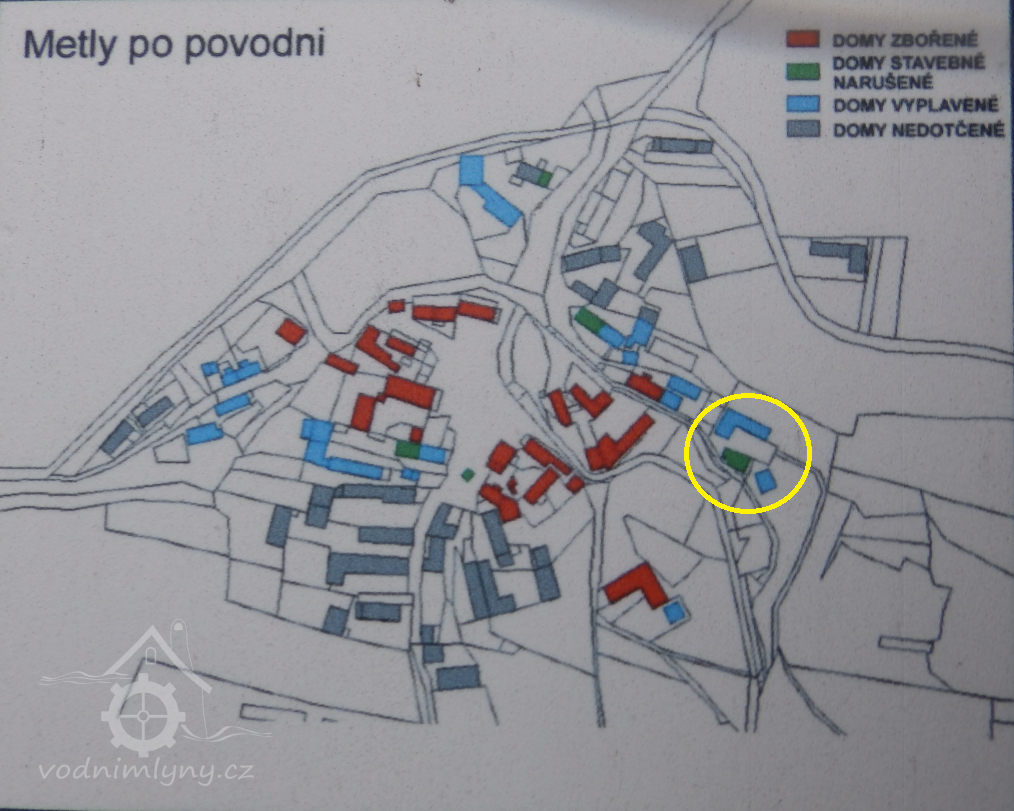 13. 8. 2002 mlýn vyplaven při protržení Metelského rybníku, naštěstí staticky nepoškozen