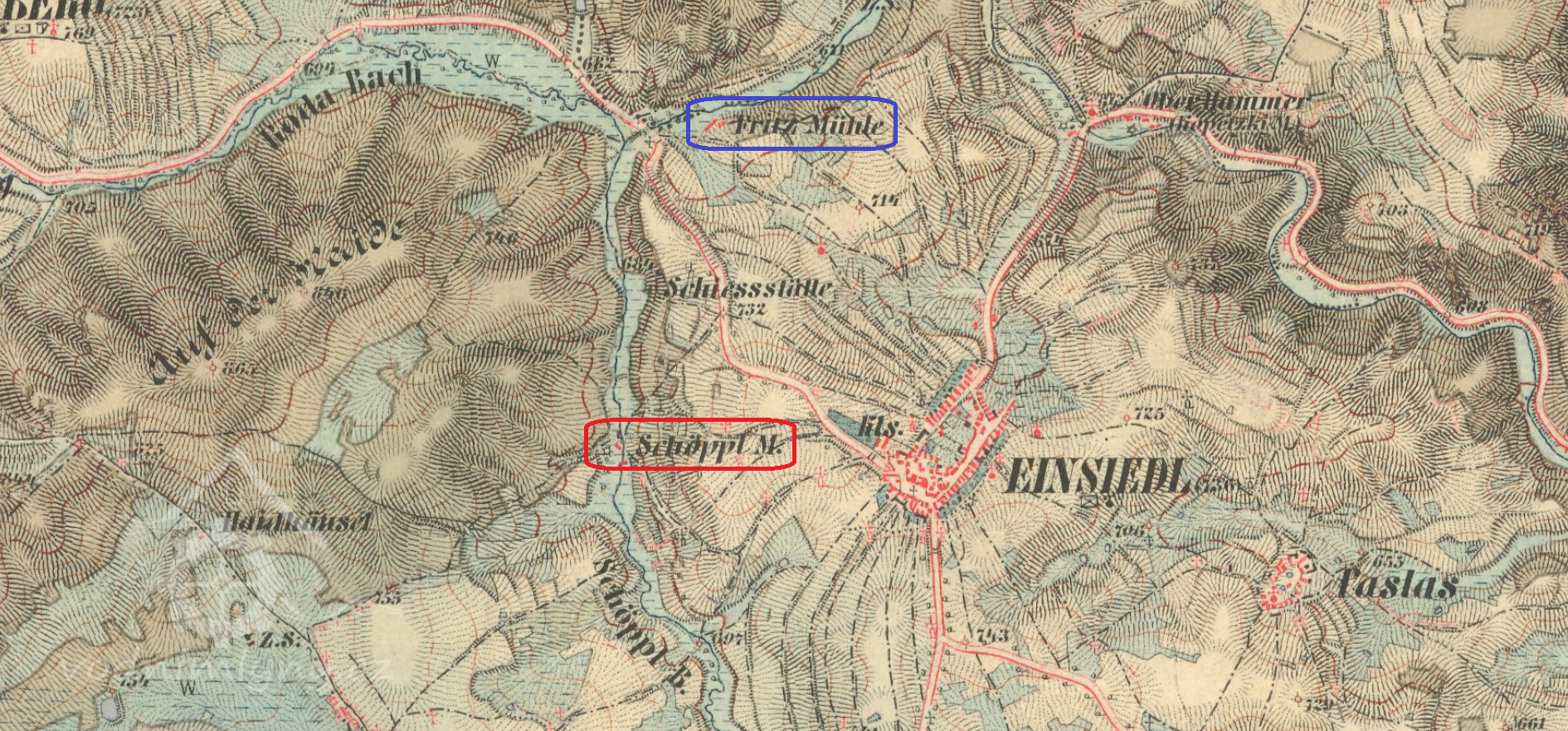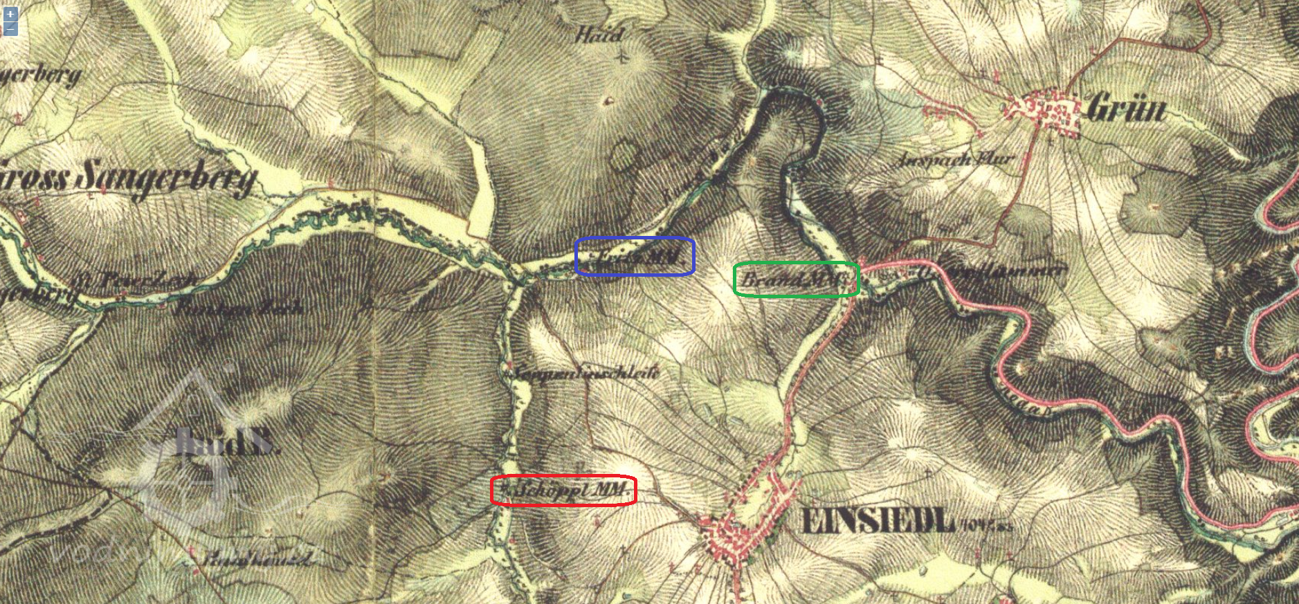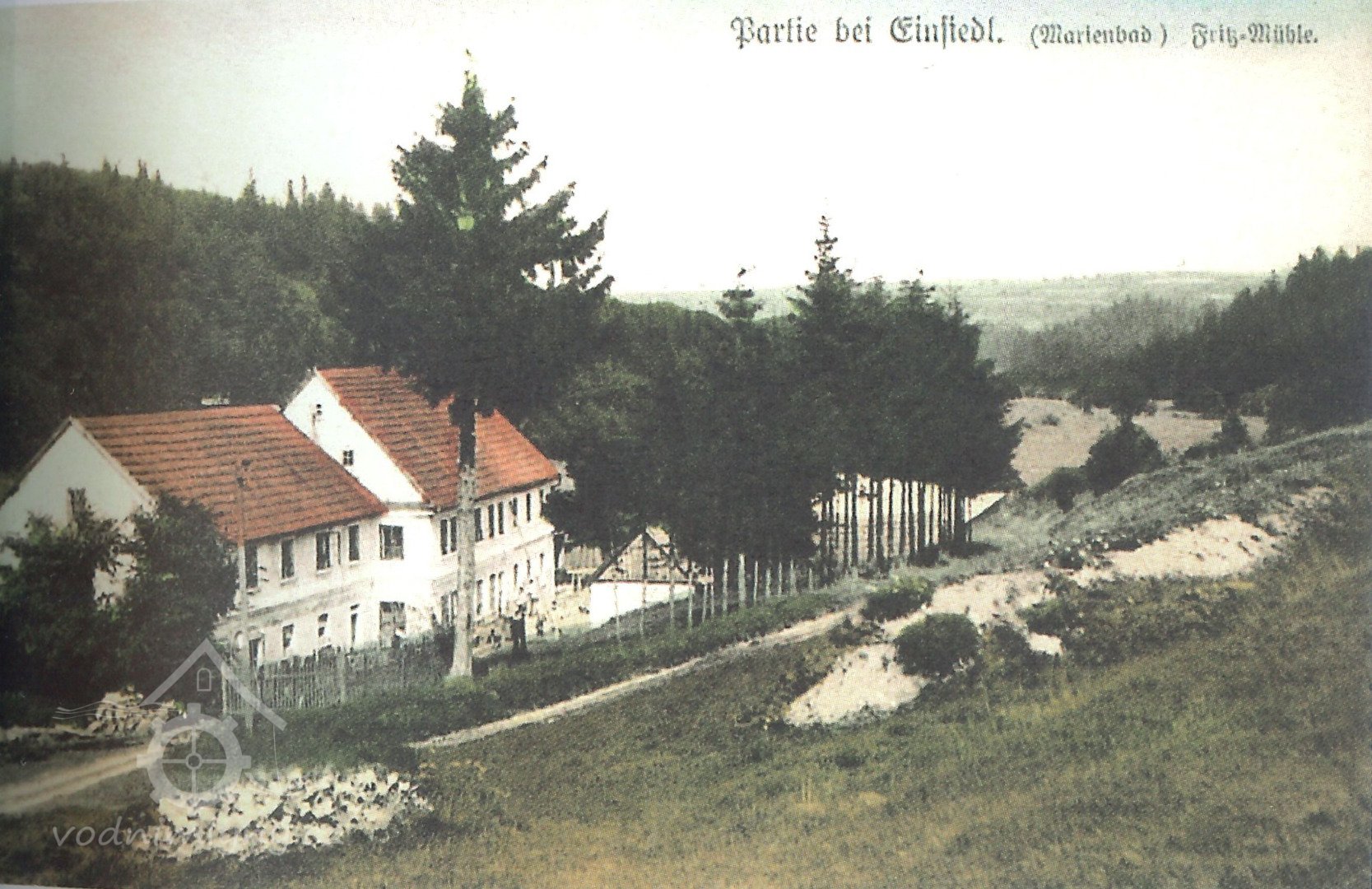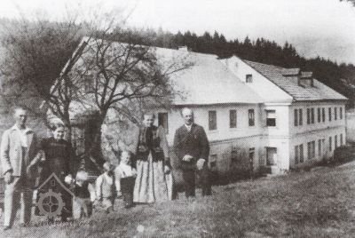 Nun sprangen unsere 2 großen Jungen nach Einsiedel, um die Feuerwehr zu verständigen. Ich stand mit meinem Mann ratlos vor der Haustür und fragte: „Werden wir den das Wohnhaus ausräumen müssen“? Nun freilich, war seine Antwort und er rief alle Arbeiter die wir hatten ins Haus um mit dem räumen zu beginnen. Die Kinder schrieen vor Angst. Die zwei kleinen Buben Fredl und Fritzl gingen hinauf auf die Wiesen, Mariechen wickelte ich in eine Decke und nahm sie mit mir in den 1. Stock hinauf um auszuräumen. Ich nahm zu erst die Betten, band sie in Tücher und warf sie zum Fenster hinunter. Dann die Wäsche hüllte ich in den großen Teppich und warf alles zum Fenster hinaus, über den Mühlgraben, wo unser Dienstmädchen Anna Hammer alles auf die Wiese hin unter räumte. Die Arbeiter entfernten zuerst das Vieh, die Pferde, die Kühe und Schweine und die Hühner wurde alles in die Scheune gebracht. Es dauerte ¾ Stunden bevor Hilfe kam aus Einsiedel und Sangerberg. Das Mühlengebäude, welches mit Schindeln gedeckt war, brannte schon Lichterloh. Die Spritze wurde in Tätigkeit gesetzt. Es hatten sich schon viele Leute im Hofe angesammelt, meistens Schaulustige. Als wir oben die Sachen geräumt hatten bis auf die Möbel, gingen wir hinunter um das Speisezimmer zu räumen. Die Hitze im Haus war schon so groß, dass das Fensterglas zersprang, ich schloss die Fensterläden, wegen der großen Hitze und nahm im Zimmer die Vorhänge und Teppiche weg. Mariechen hatte ich immer bei mir, die Buben standen mit im Hof unter den Leuten. Ich dachte nur immer, wenn nur jemand käme und mir das Kind in Obhut nehmen würde.