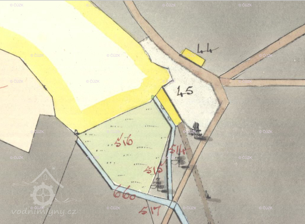Pozoruhodně zachovaný malý objekt na vodní pohon pod rybníkem Žebrák severně od Černívska, v literatuře dosud nezmiňovaný.