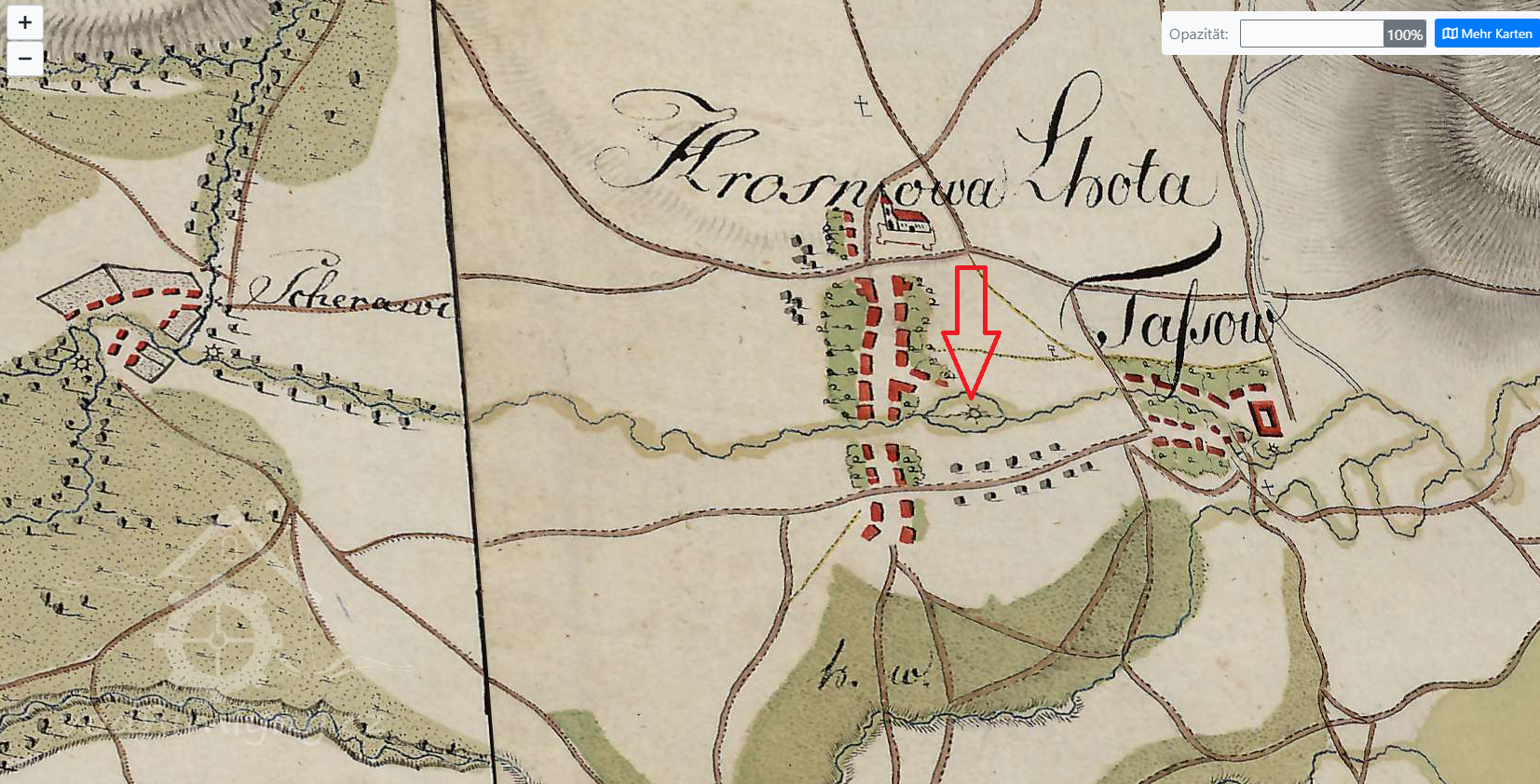 575 m jižně od kostela sv. Jana Křtitele v Hroznové Lhotě