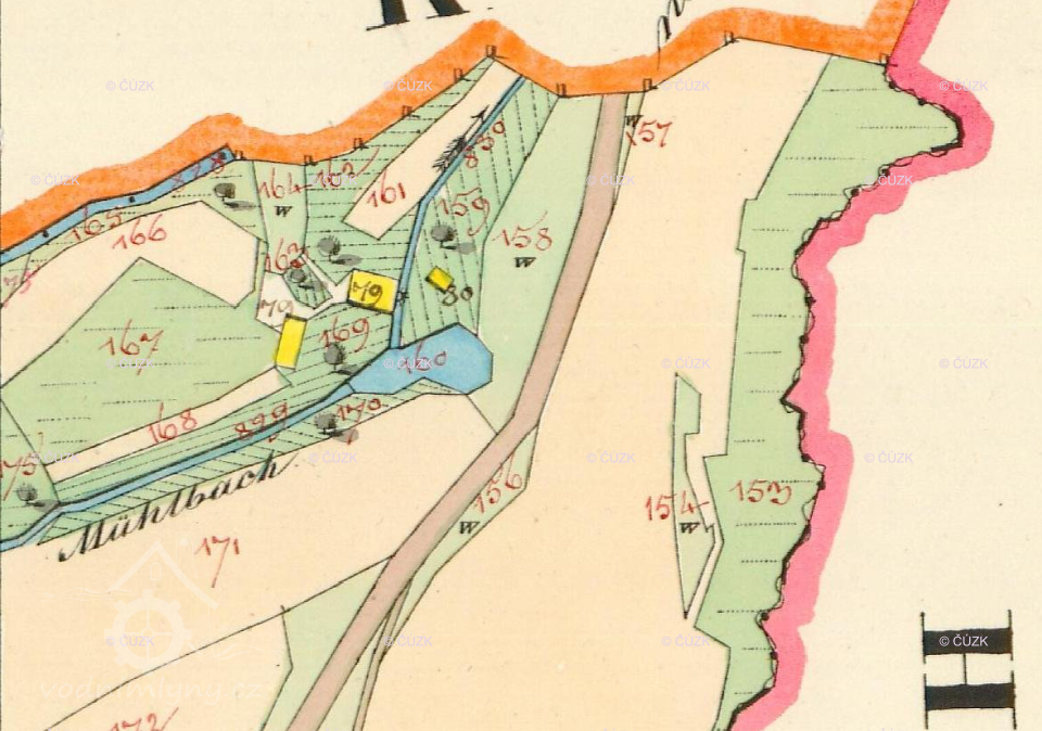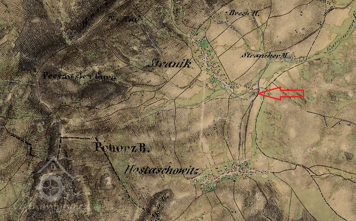 Mlýn ležící téměř ve Straníku a se stranickým popisným číslem, katastrem však náležející k Hostašovicím. Doložen k roku 1616, 1904 ukončeno mletí, 1944 zbořen, na jeho místě novostavba čp. 140.