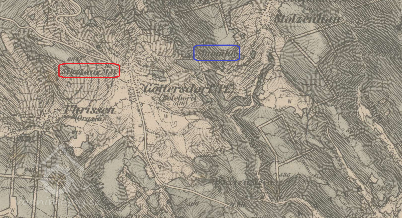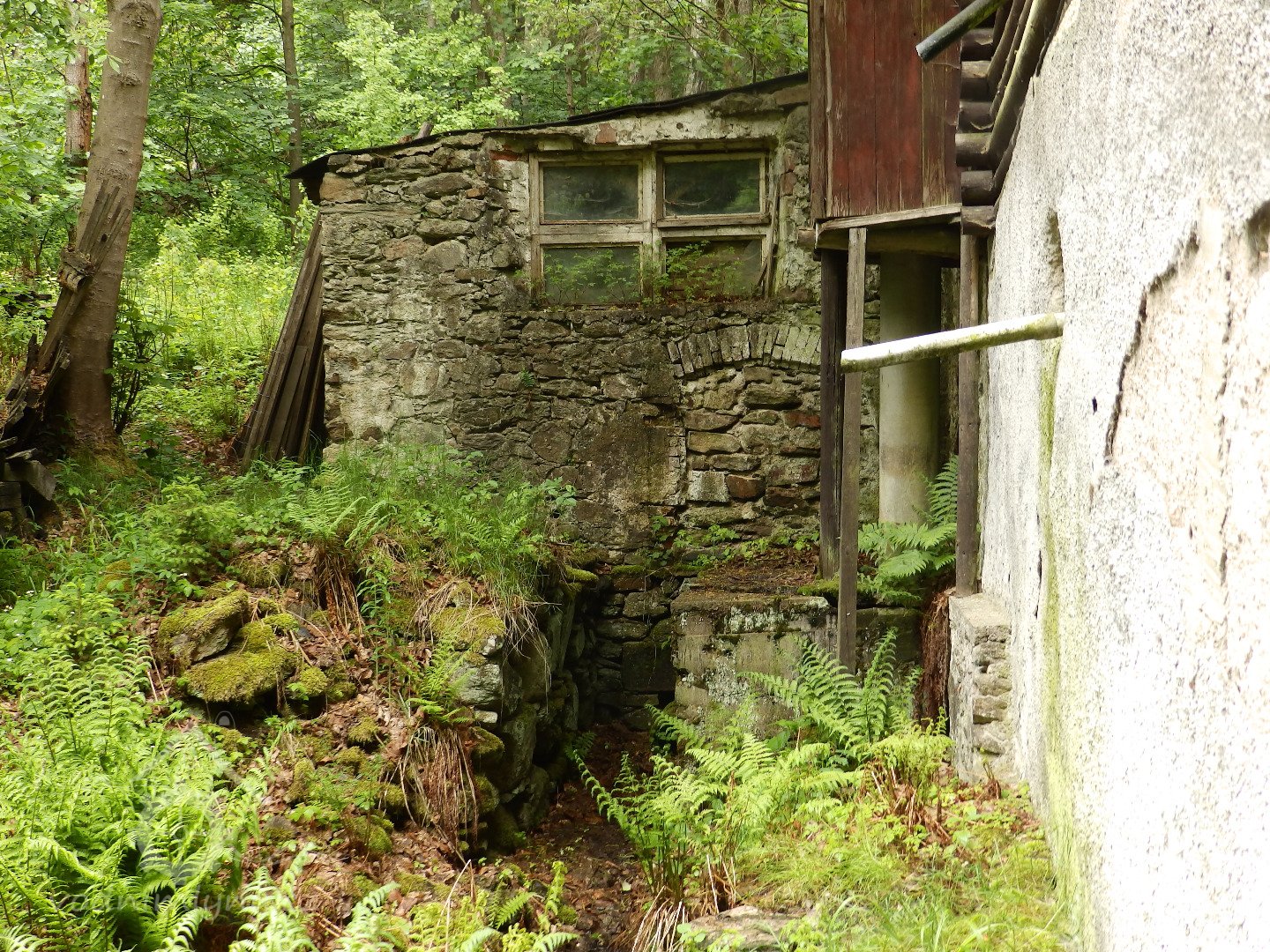 Zaniklý mlýn na samotě v údolí pod Pyšnou (Stolzenhainem), na jeho troskách vystavěna rekreační chata, částečně zachována lednice.