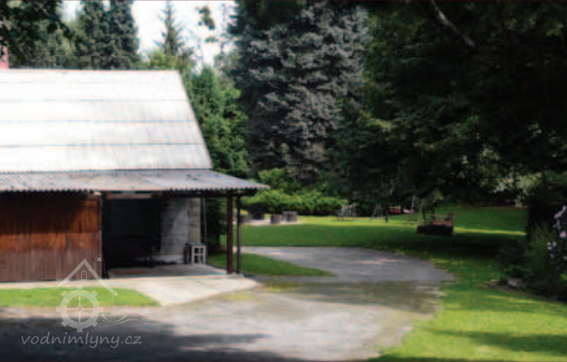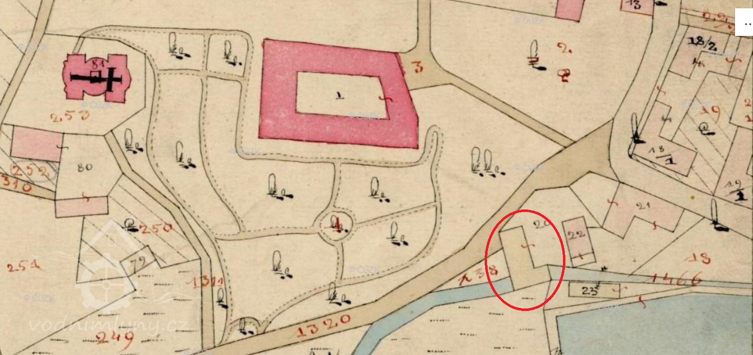 Zaniklý mlýn pod zaniklým zámkem. Mlýniště leží v soukromé zahradě.