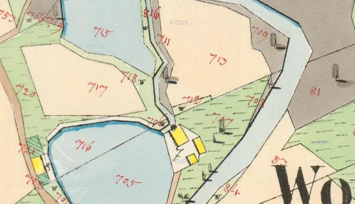 Mlýn mezi dvojicí rybníků, dnes zaniklých.