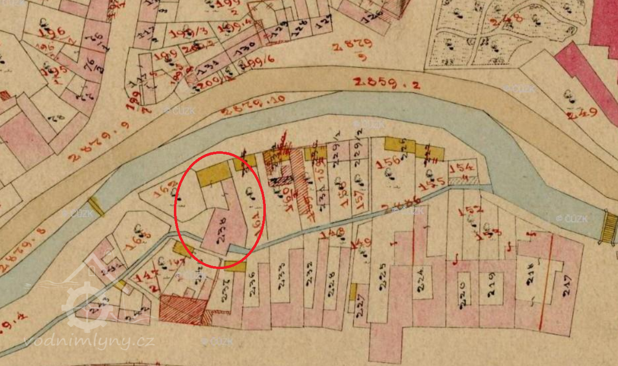 Náhon na mlýn Jelínkových a Ležákových odbočoval z Bystřičky levým břehem nad splavem u zámku.