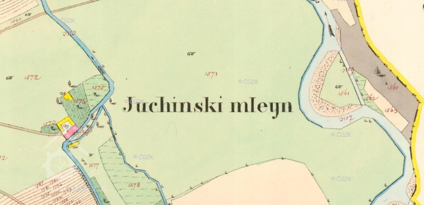 Nad splavem odbočuje levým břehem z toku Juhyně vodní náhon na mlýny Hradilův (Potoční), Plachých (Trávnický, Juhyňský, Újezdský), Přílesí, Šejdův ve Všechovicích a Podhrázdný pod Všechovicemi.