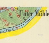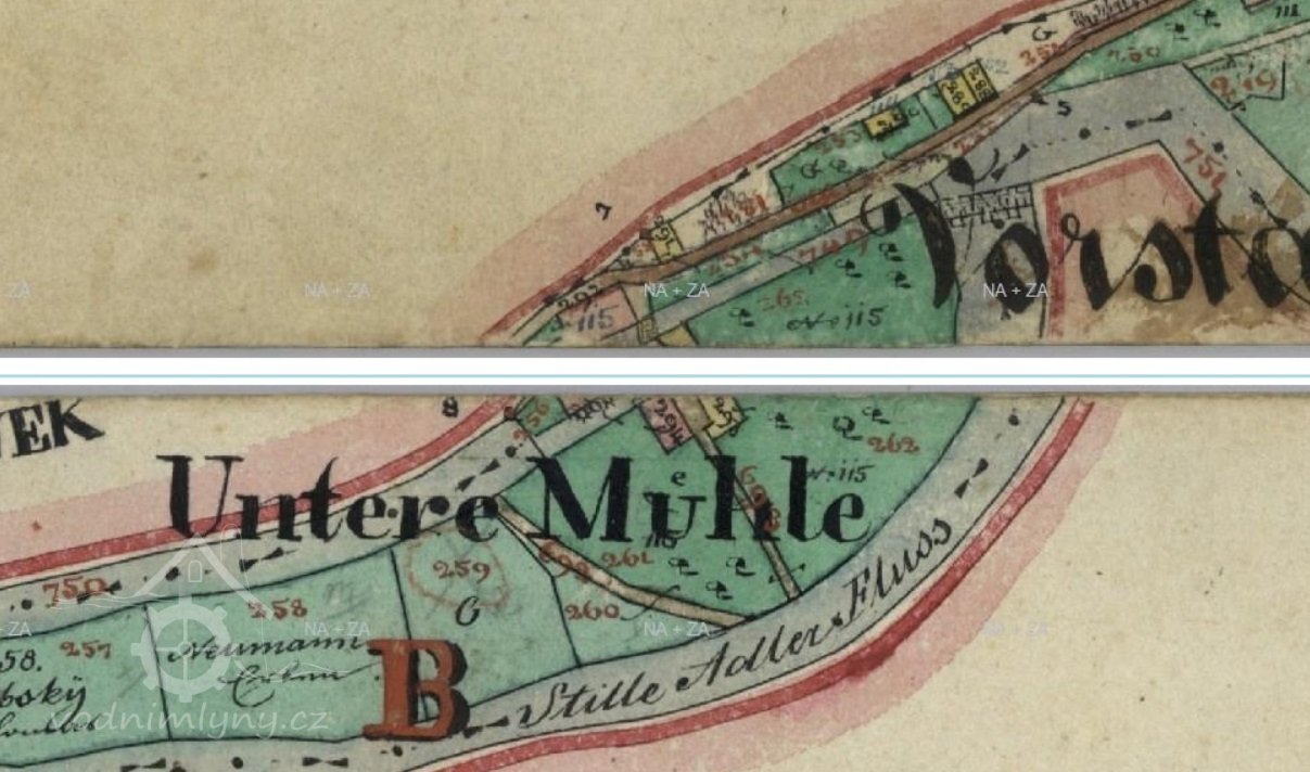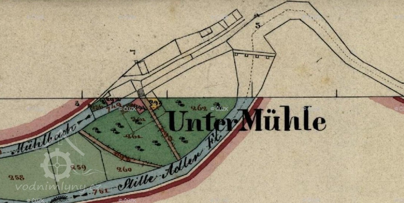 V Tereziánském katastru je uveden panský mlýn o jednom kole na nestálé vodě, užívaný vrchností. K roku 1714 je s olejnou. Starý mlýn stával blíže k cestě, mlecí stroje poháněla dvě kola. Z druhé strany náhonu stávala pila poháněná jedním kolem a stoupa, poháněná také jedním kolem.