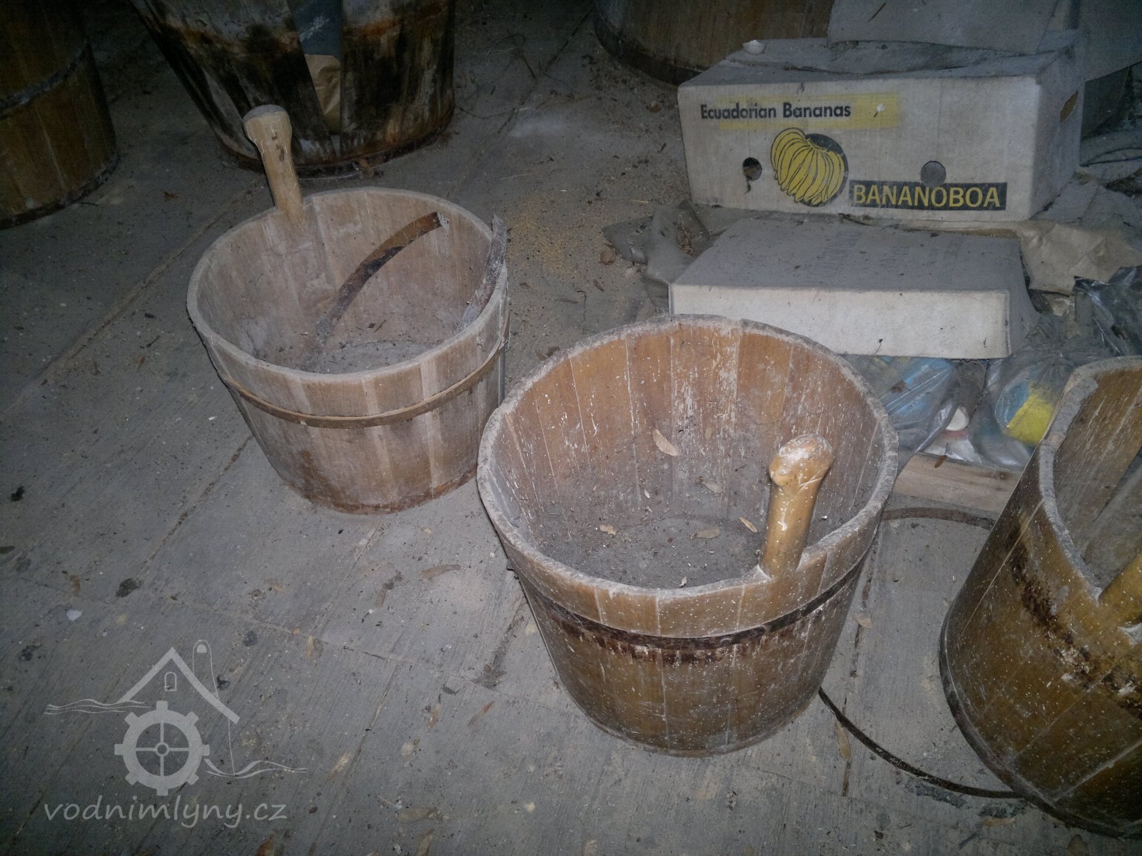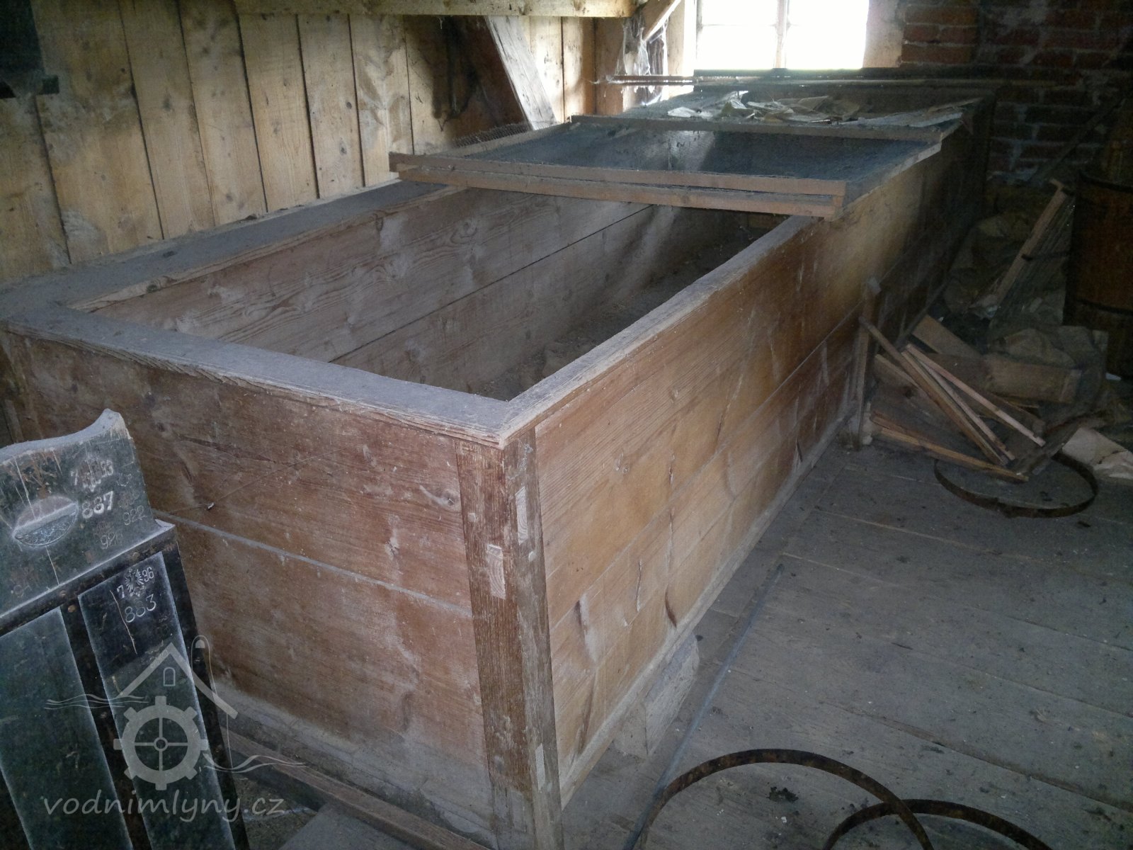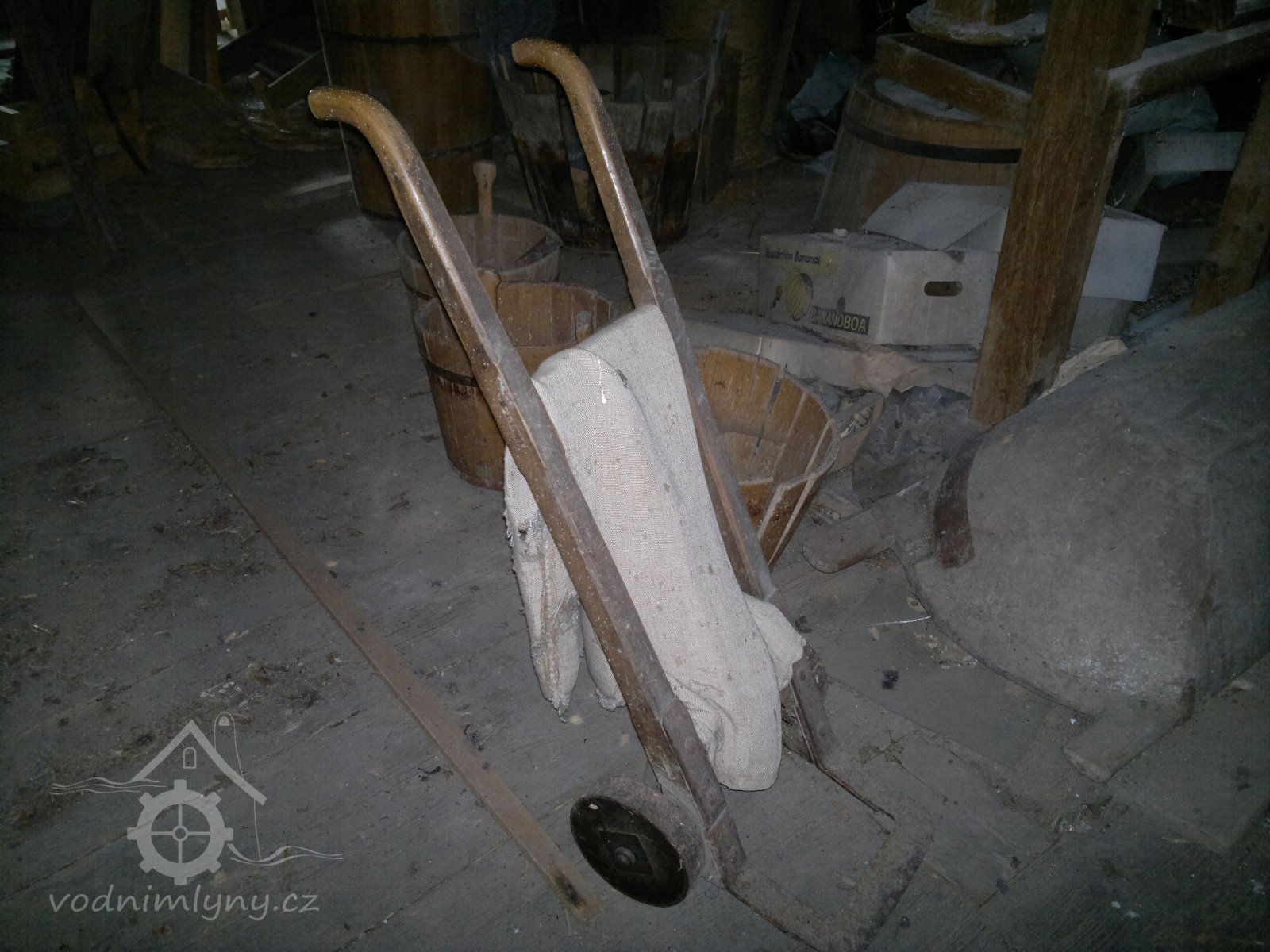 Transmise, paleční kolo, převody, kapsové výtahy, čistící zařízení, mlecí kameny, moučnice, vodní kolo s hřídelí.