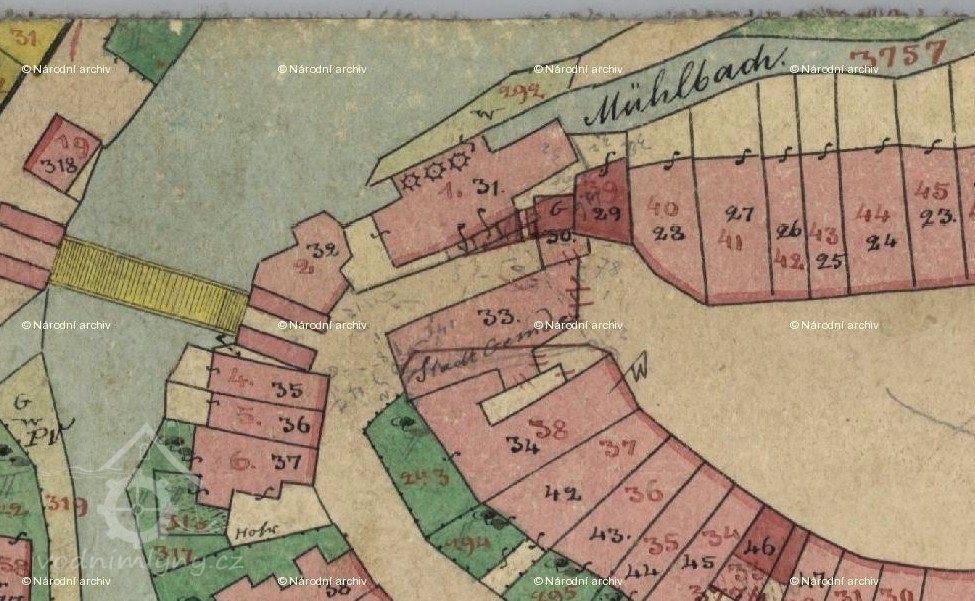 Majitel od č. 27 nesmí dávat vyšší nástavky nežli 12 coulův českých a nesmí vodu ubytečnou ani ani zdržovati ani vypouštěti k škodě č. 1 - vid. sbírku listin dtto. 29/4. 1826.