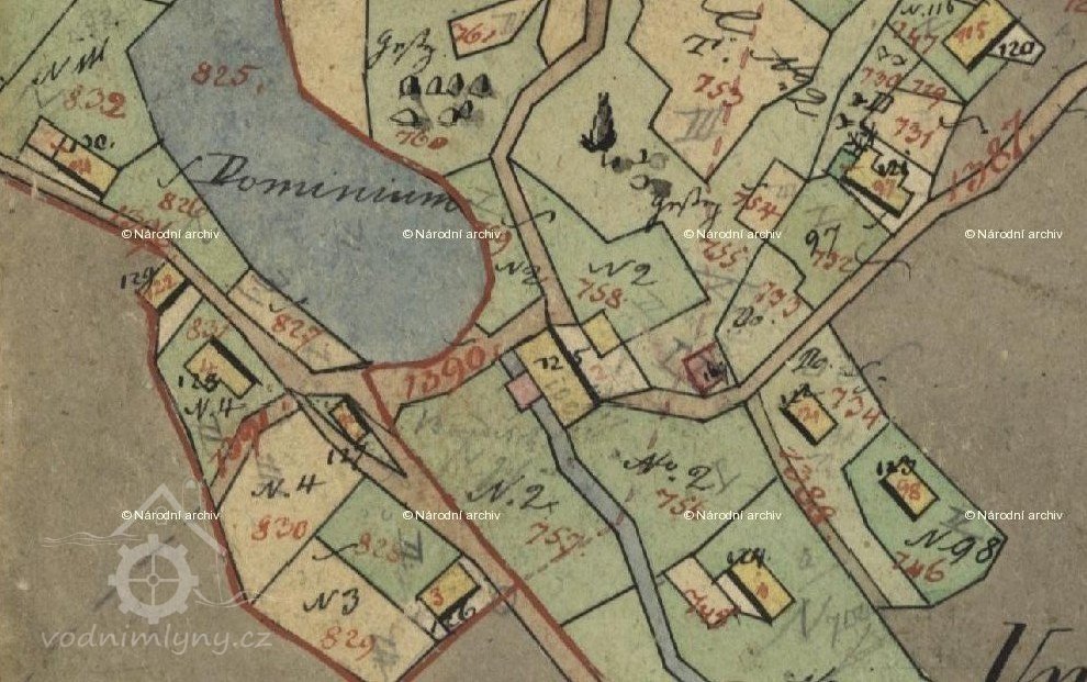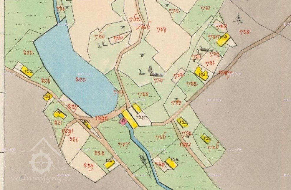 PopisVodní kniha uvádí průměr kola na vrchní vodu 4 m, hl. korečků 25 cm, průtok 180 l/vt., spád 4,41 m, výkon 6,9 HP.