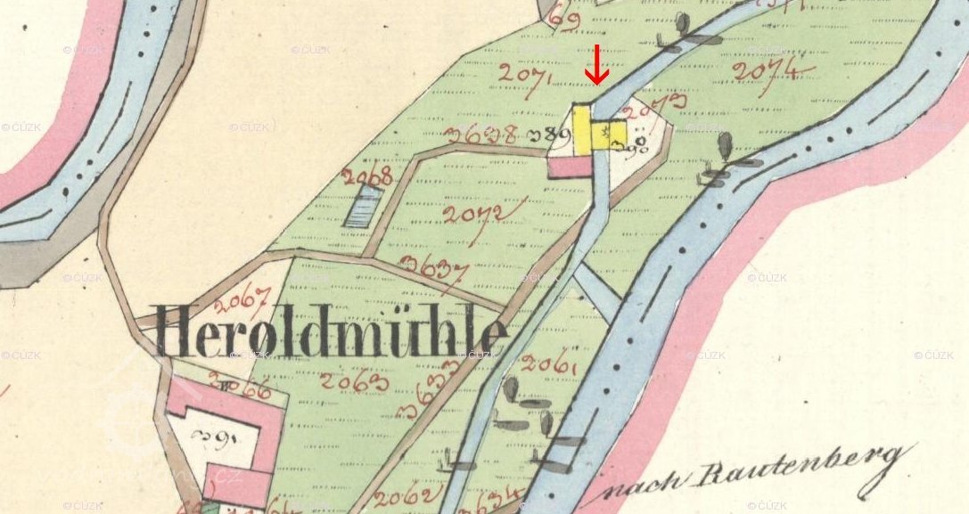 Podle jednoho starého spisu, který r. 1817 shořel, byly prodány pozemky pod dolními chalupami u spojovací cesty na Roudno od svobodného hamernického statku a železárny dolních chalup našemu předku Martina Herolda 1548. Knížecí nájemné pozemky 34 korců breslavských mír u kříže zakoupeny Franzem Heroldem r. 1800.