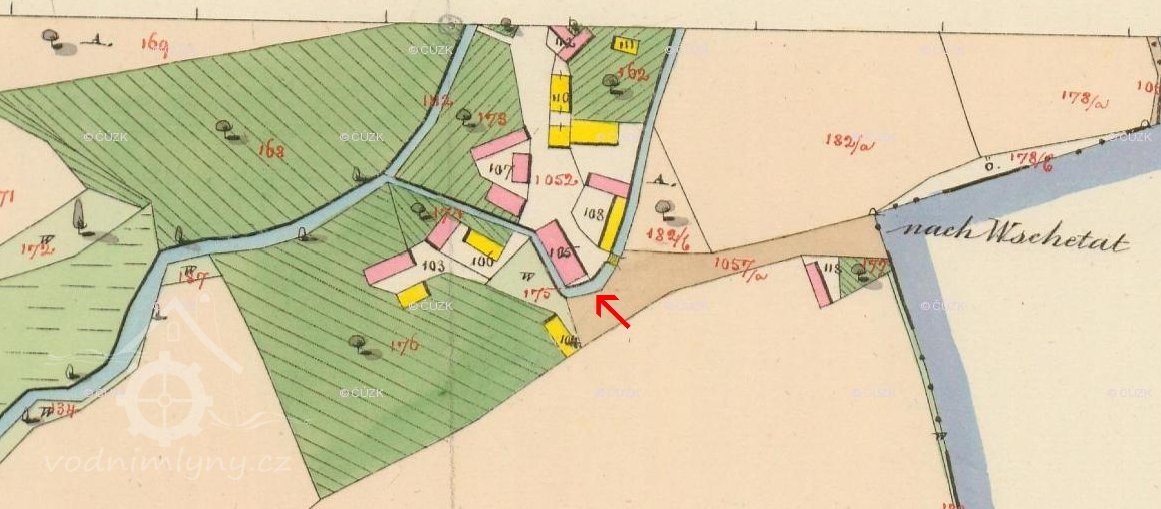 Náhon z Košáteckého potoka vede těsně kolem mlýna. V zadní části jsou zbytky po turbínové kašně.