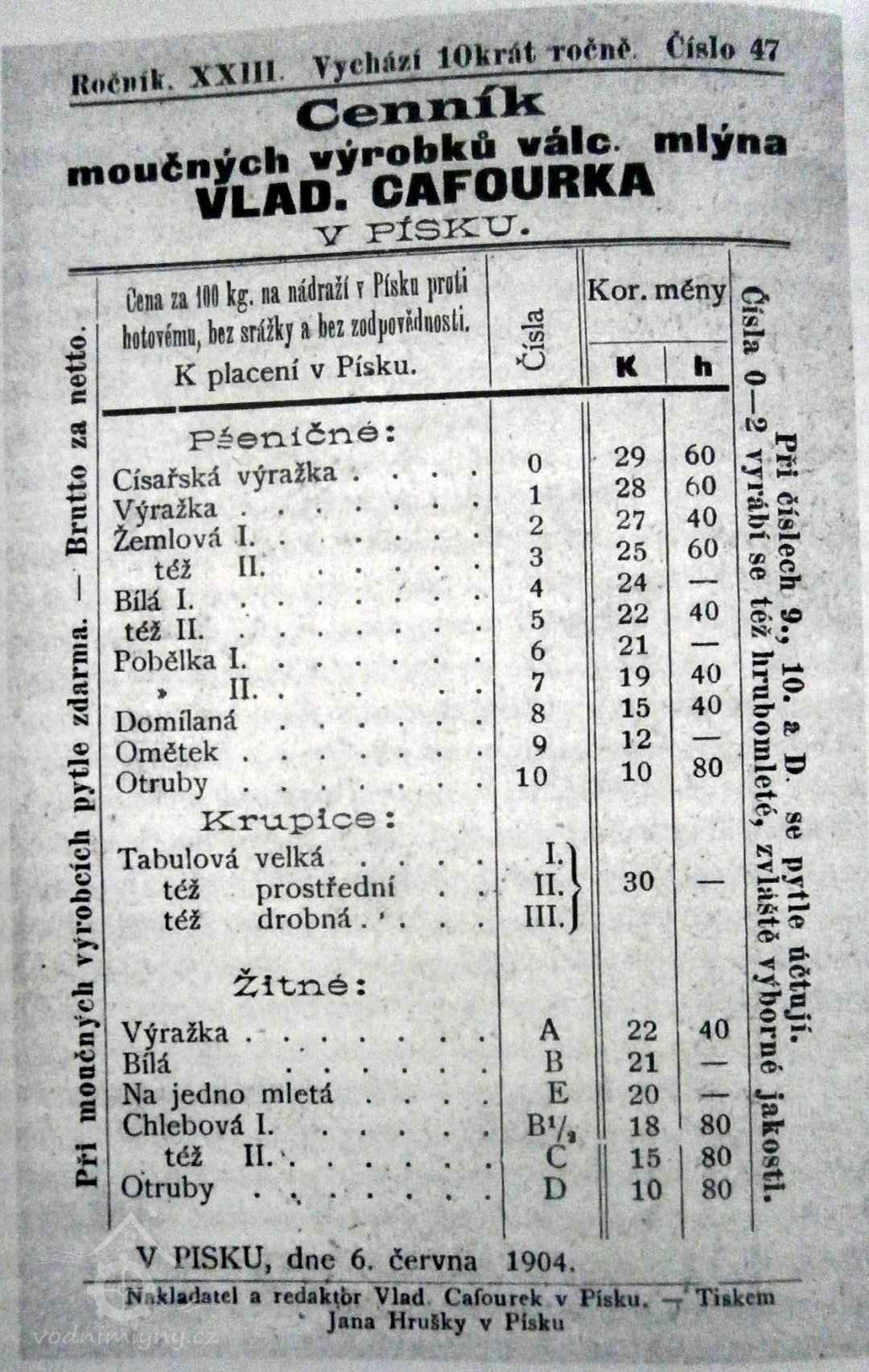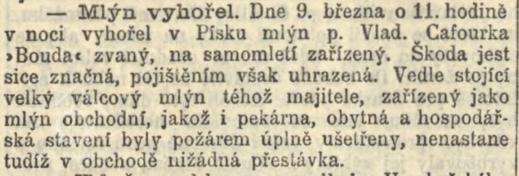 1899 - majitel mlýna Vlad Cafourek členem výboru Spolku mlynářů česko-moravských (Fr. Duška, Kapesní kalendář mlýnů česko-moravských) (HŠ)