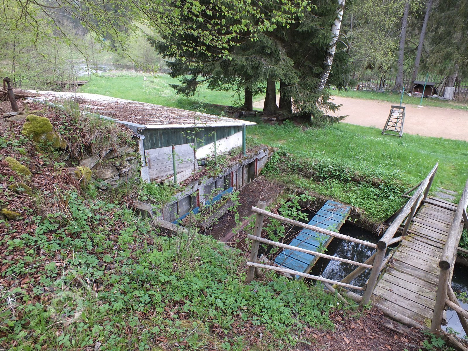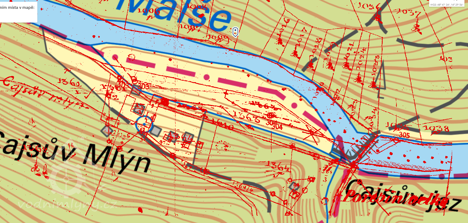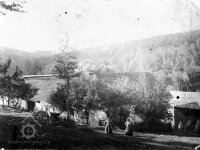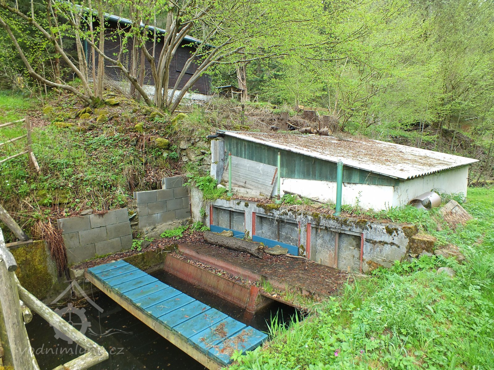 Patrné základy novějšího velkého mlýna, odstřelen 1963, zachovaný turbínový domek možná s funkční elektrárnou.