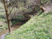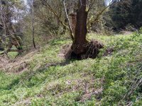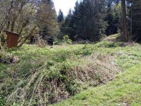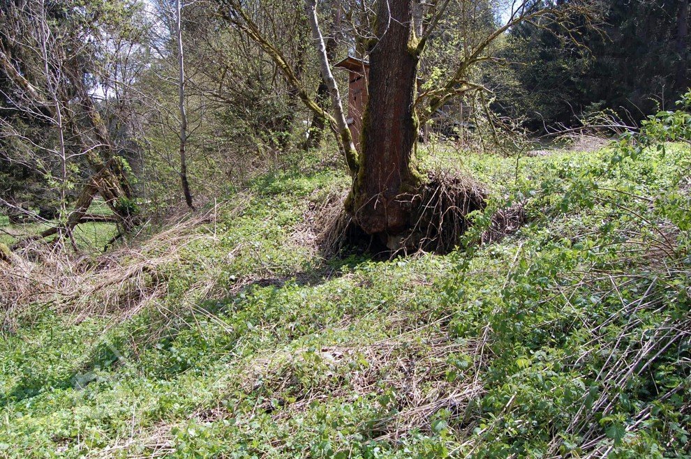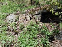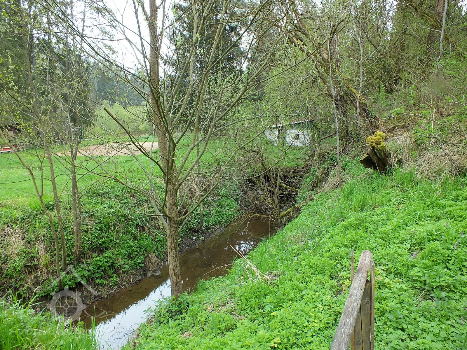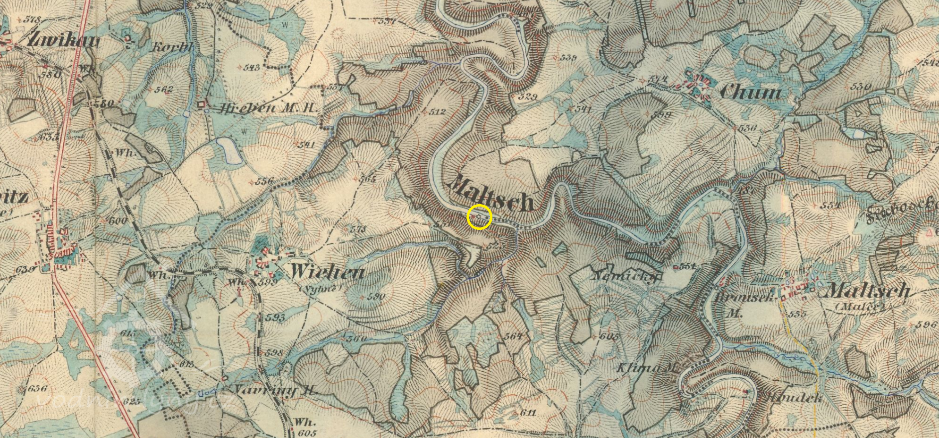 Patrné základy novějšího velkého mlýna, odstřelen 1963, zachovaný turbínový domek možná s funkční elektrárnou.