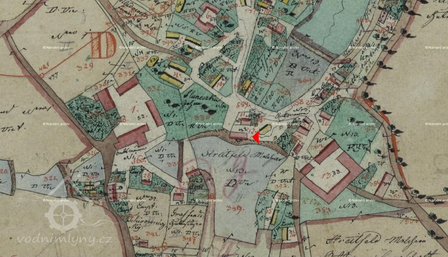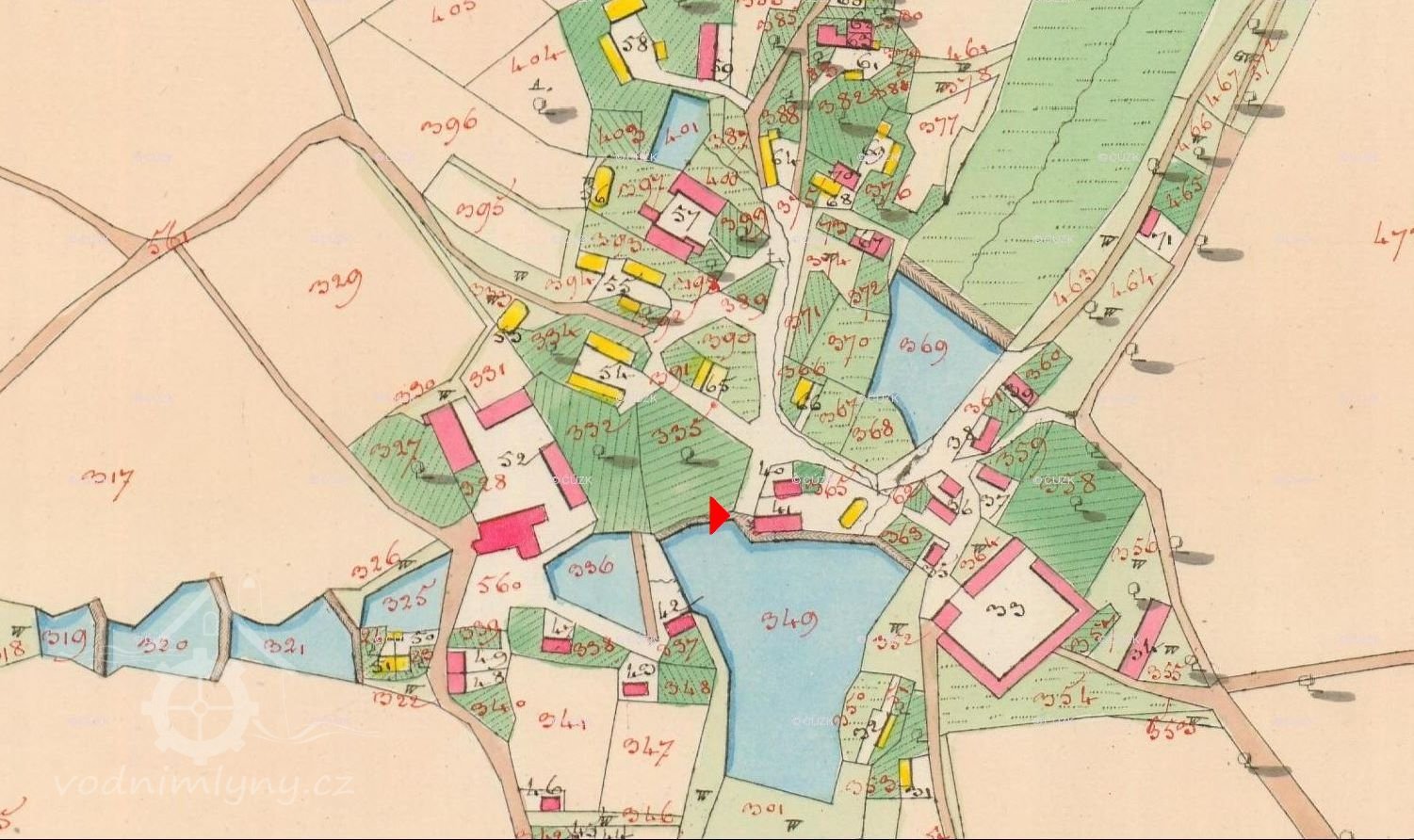 Podle identifikační skici a skutečnosti byl nad mlýnem rybník, který není v současné mapě, ale byl obnoven. Nejspíše voda šla rourou z rybníka rovnou na vantroky a kolo.