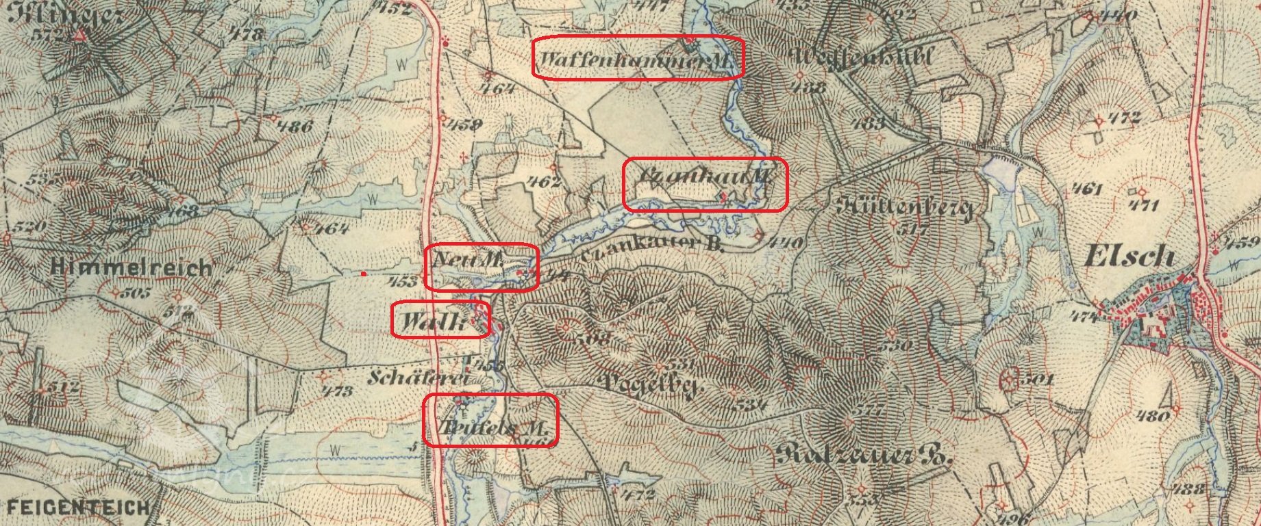 Novodobě upravený areál mlýna na Čankovském potoce na kraji osady Valcha; na mapách stabilního katastru je označen jako Neu Mühle (obě budovy jsou značeny žlutě).