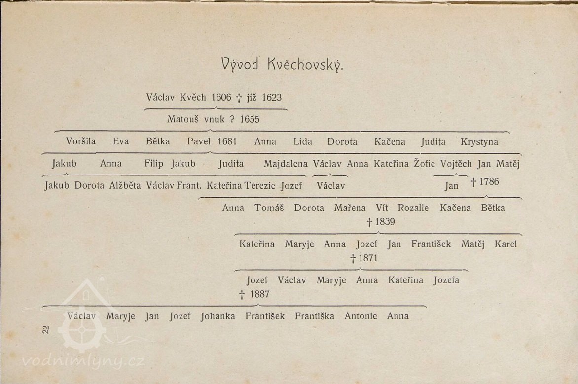 1887 Josef Kvěch nejml. přebírá mlýn za 20.570 zl. a 80 krejcarů; oo Anna roz. Šimáková (12.6.1866 - 9.10,1903), 11.4.1904 II. oo Marie Sosnovcová (* 8.12.1871)