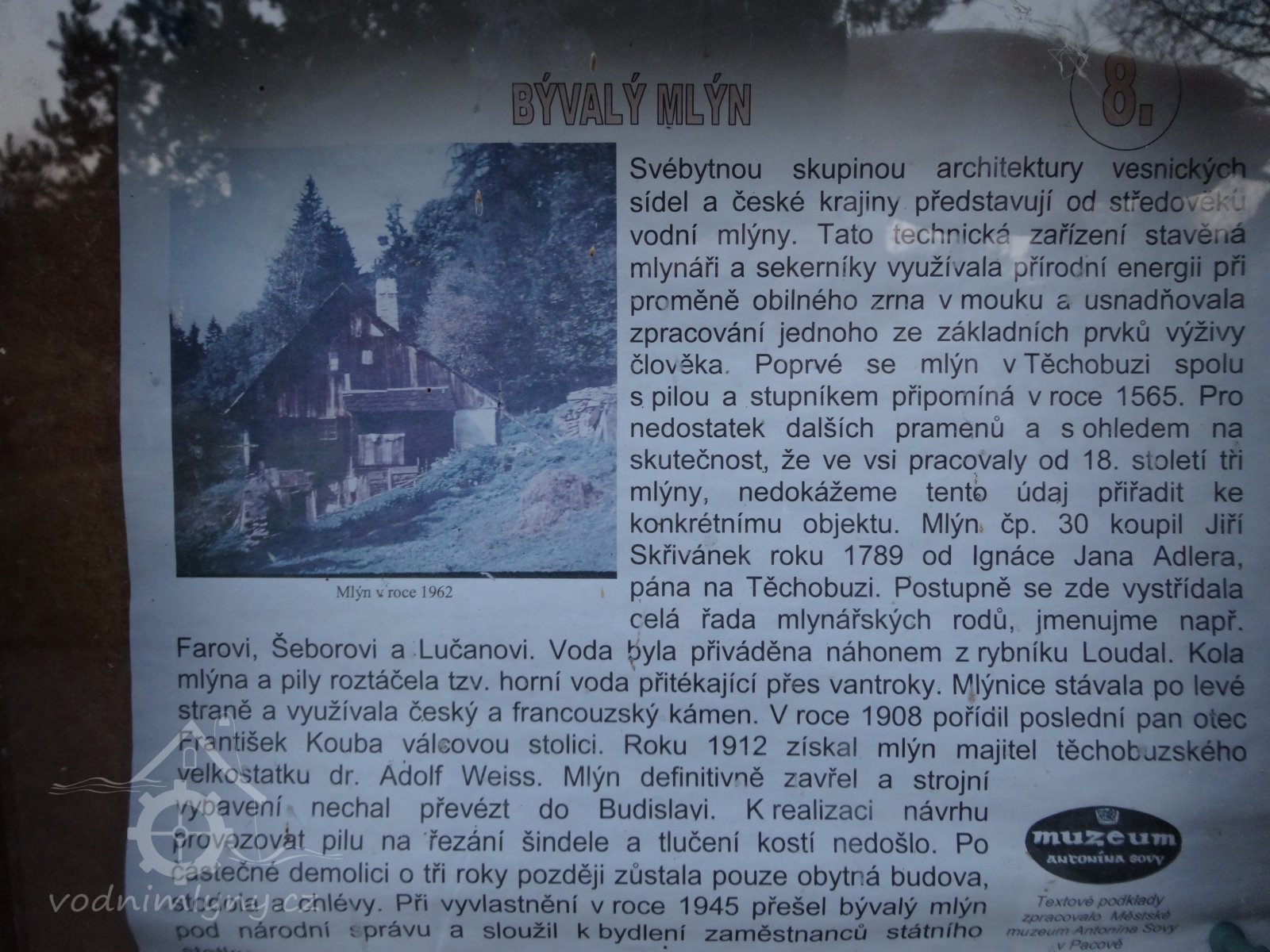 Mlýn uprostřed vesnice Těchobuz by nikdo nehledal. Ani v terénu nejsou jednoznačné stopy. Na místě bývalého panského mlýna stojí nová chalupa a před ní tabule místní naučné stezky, která nás seznamuje s jeho historii. Mlýn byl postaven někdy v 17. století. Po více než sto letech jej koupil poslední z mlynářů rodu Skřivánků nebo jen Křivánků podle toho, jak to pan farář napsal do matriky. Po další stovce let se vrátil do vlastnictví místního panství, které jej zrušilo, neboť ve stejné době už byl přestavěn a modernizován Nový mlýn u rybníka Daniel.