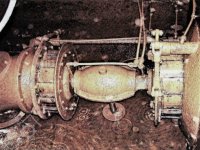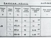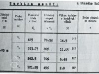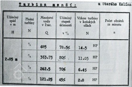 1) menší turbína: spád 2,85 m, hltnost 485 l/sec, výkon 14,5 HP