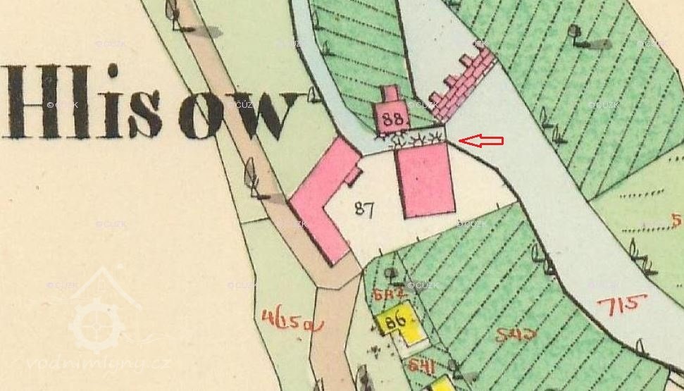 Dle přiloženého situačního plánu teče voda potokem Klejnárka ku mlýnu, je tam nadržována jezem, na kterém se nástavky prkenné nalézají. Voda vchází dle vedle stojící skizzi stavidlem A do žlabu ve kterém se pak nacházejí 3 stavidla a to C, D, a E. Vedle toho žlabu je jalový, ve kterém se nalézá jedno kolo ku mletí při malé vodě. Kola se stavidly C, D, E jsou vrchní a B je spodní.