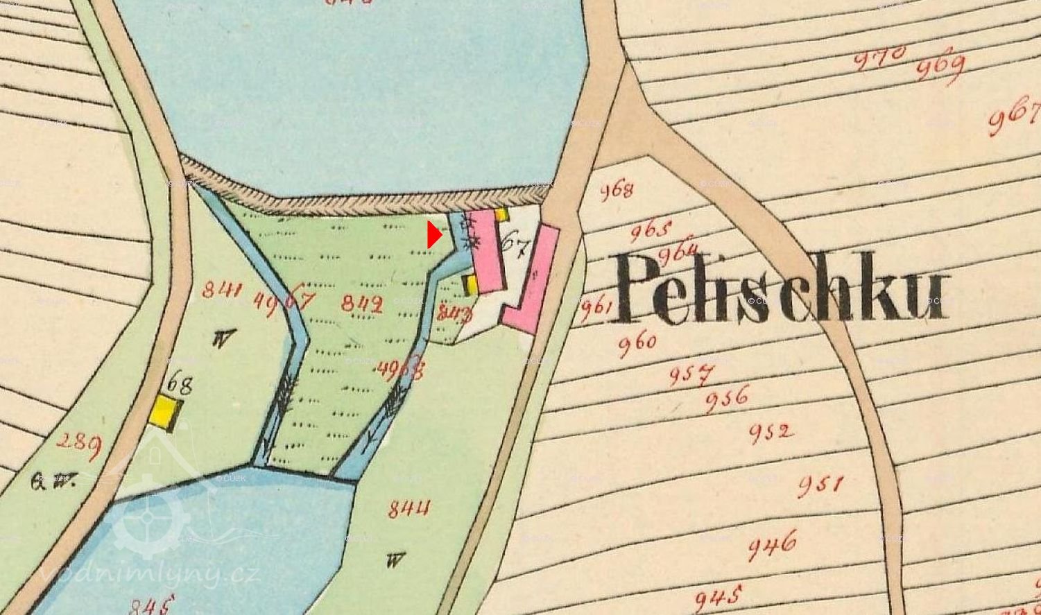 Z rybníka se voda pouštěla stavidlem a dřevěnými vantroky na vodní kolo, po vykonání práce odtékala voda otevřenou struhou do vodoteče, do rybníka nad dalším mlýnem. -- D.V.